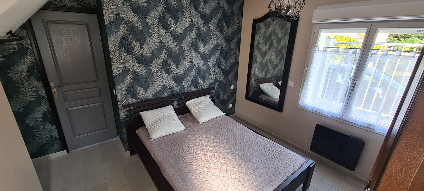 - 1 chambre type suite parentale avec un lit de 140, 1 salle de bain avec WC, simple vasque et douche