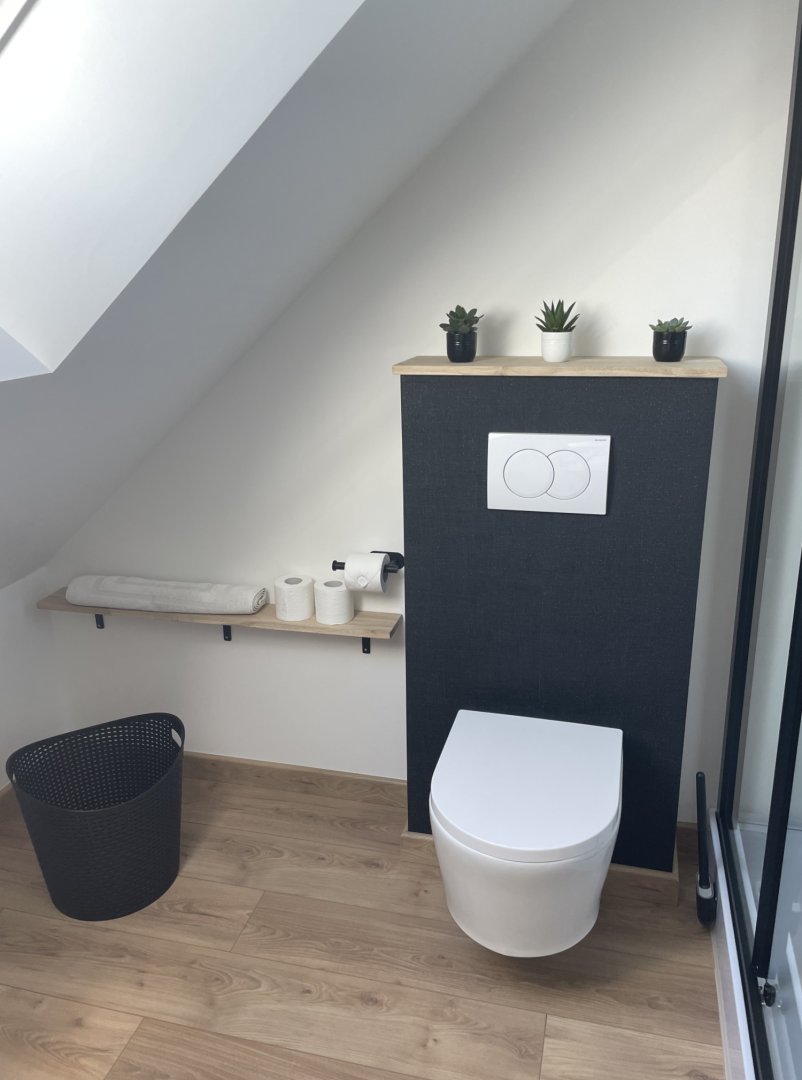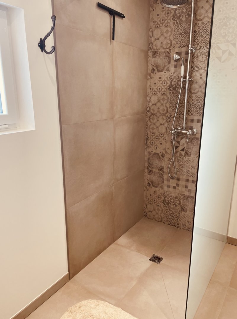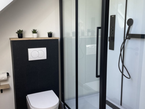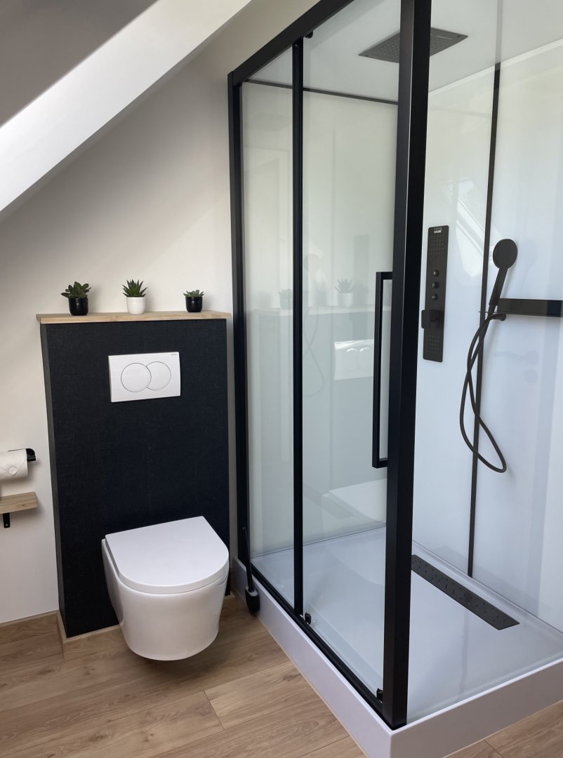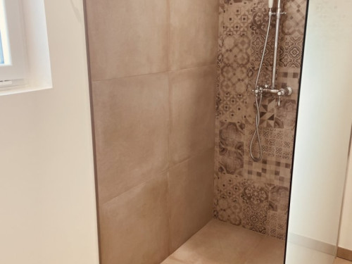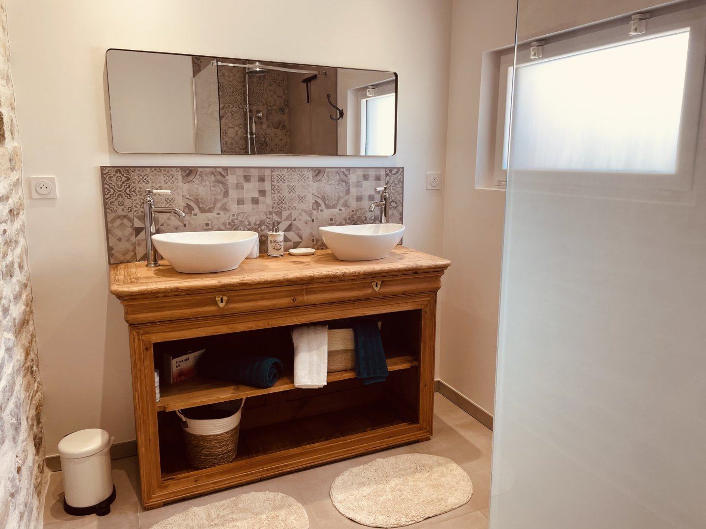 -2 salles de bain, une au rez-de-chaussée avec douche à l’italienne et doubles vasques, une à l’étage cabine douche et vasque.