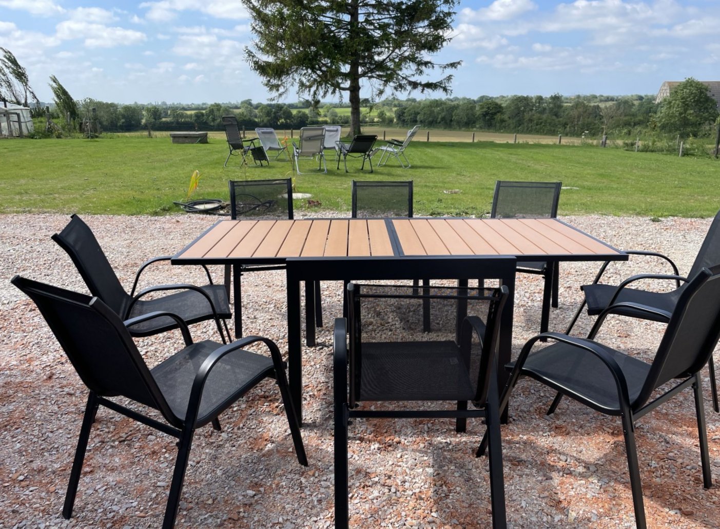 -un salon de jardin, parasol, barbecue, transats et chiliennes avec une vue imprenable sur le hangar à dirigeables vestige de 1917.