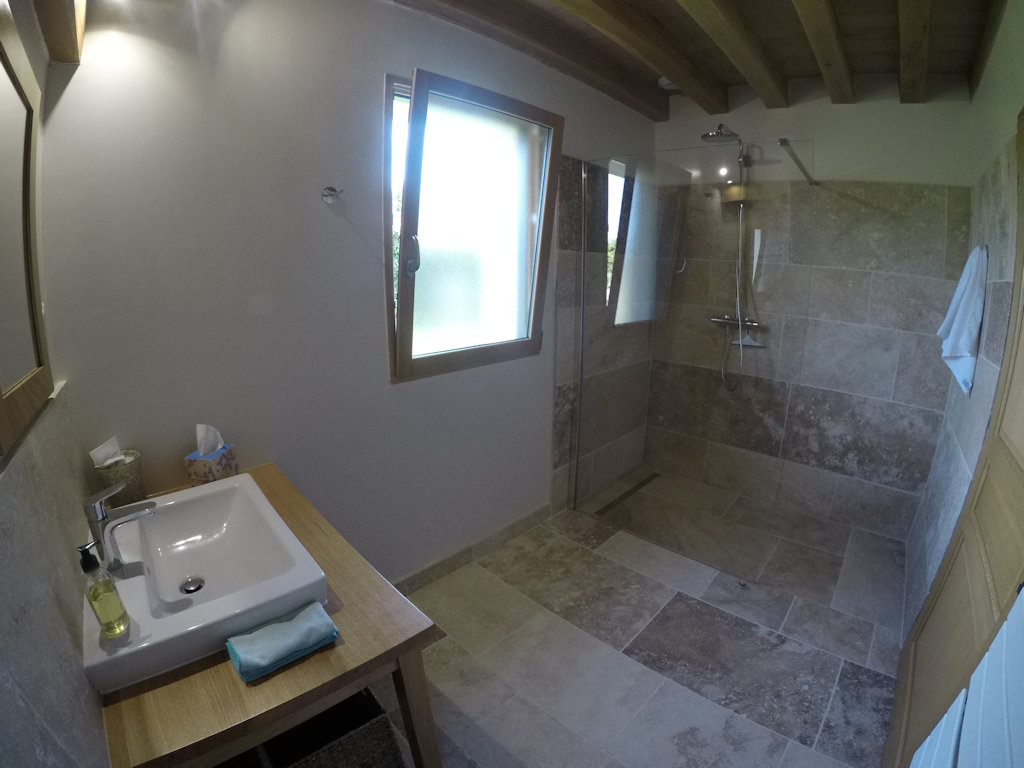 Salle de bains 1 : Douche à l'italienne, Vasque, Sèche-cheveux, Sèche-serviettes