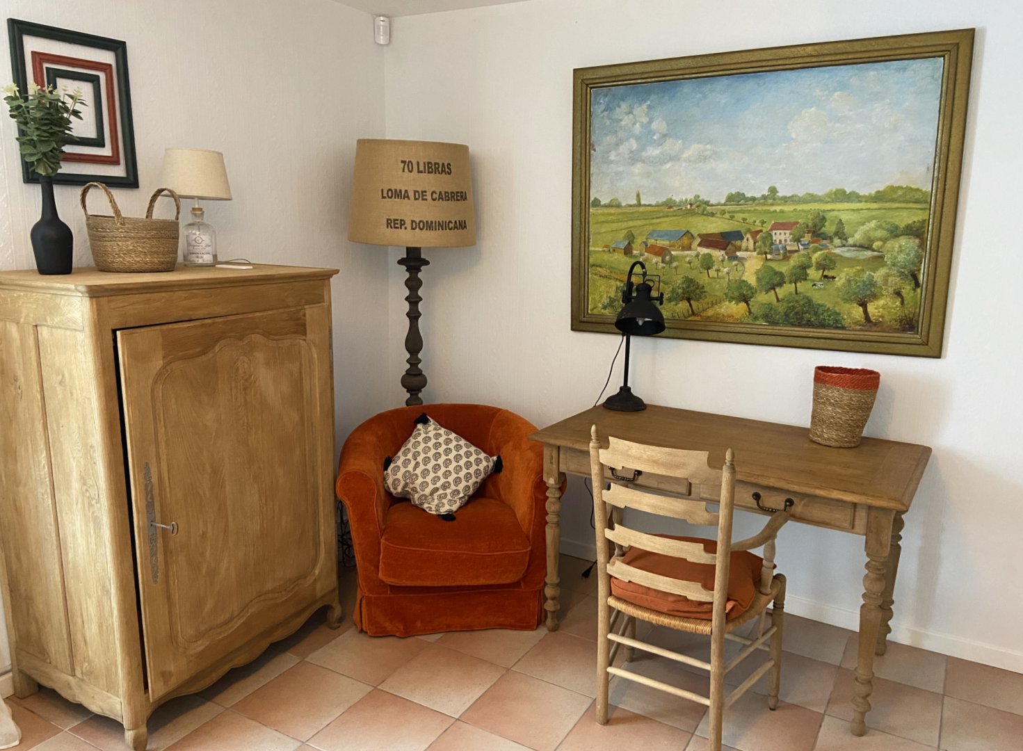 5 chambres dont une se trouve à l’extérieur, attenante à l’habitation avec balcon (chambre rose).