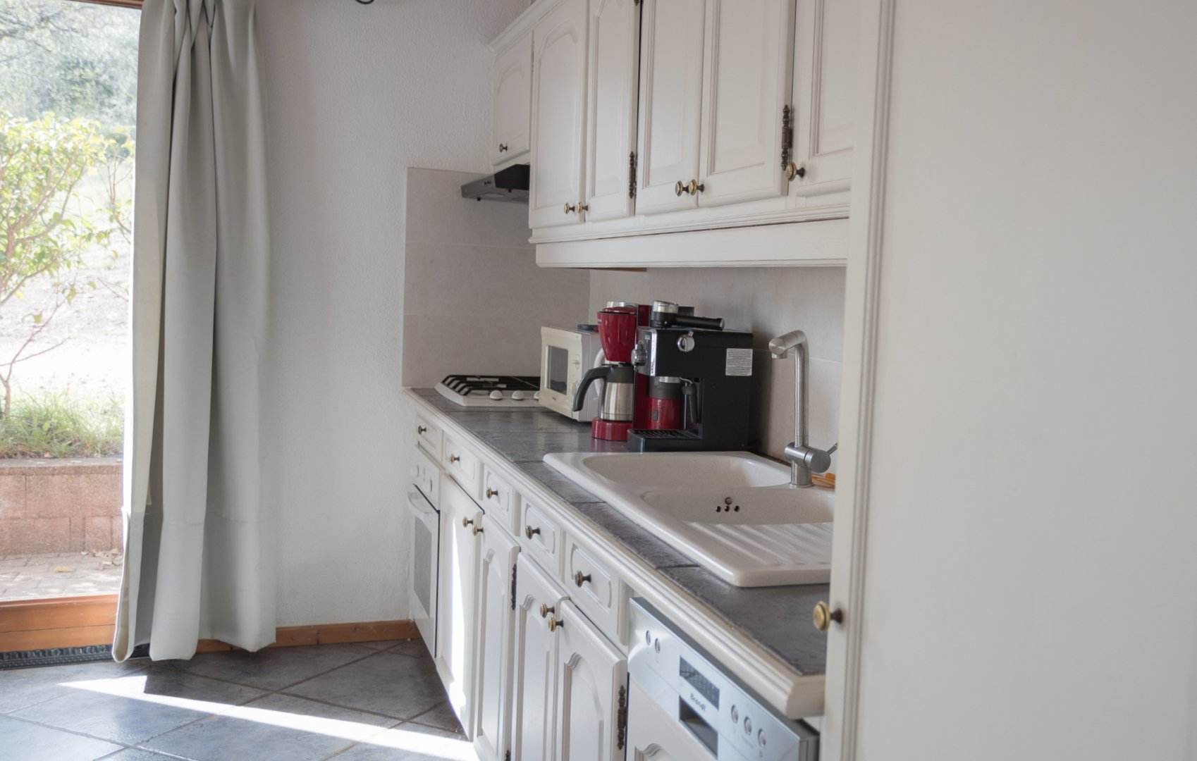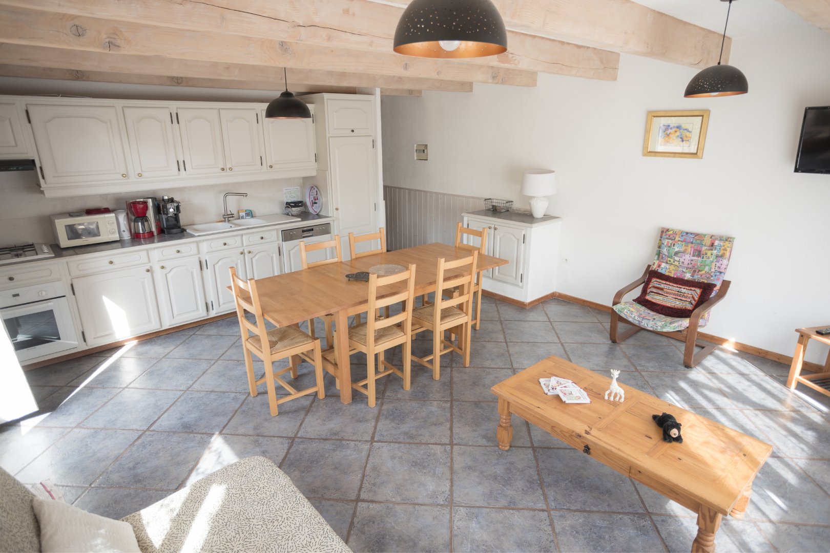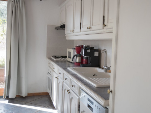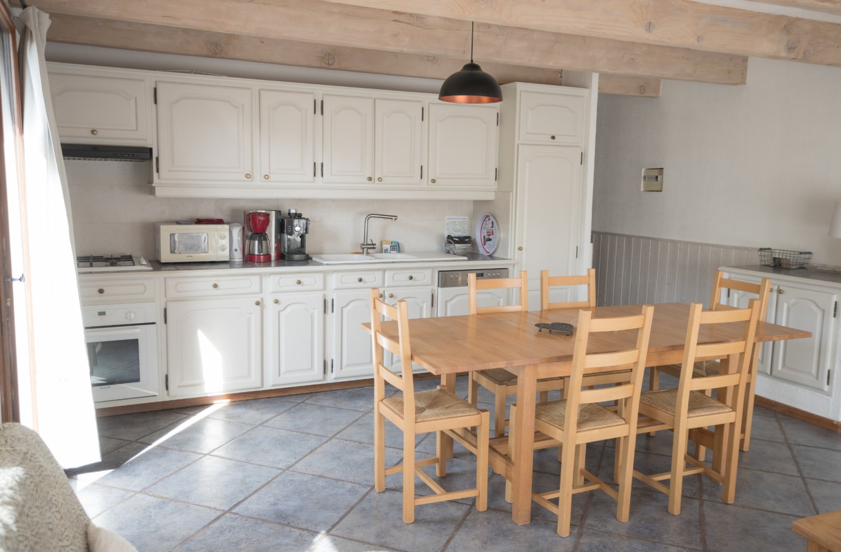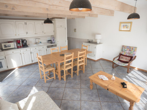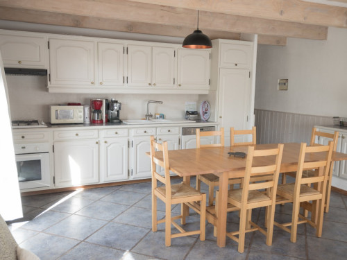 - 1 salle de séjour, avec 1 grande baie vitrée, avec clic-clac 2 pers., TV écran plat, vaisselle de qualité en quantité, cuisine équipée, avec lave-vaisselle, très grand frigo congélation, machine à café expresso (compatible Senseo) et filtre, grille pain et micro-ondes.