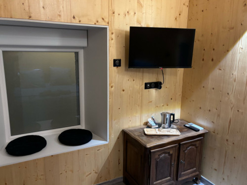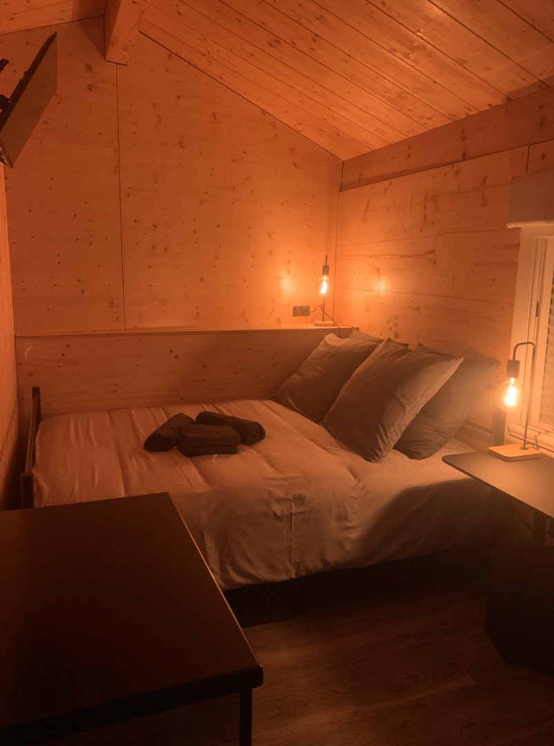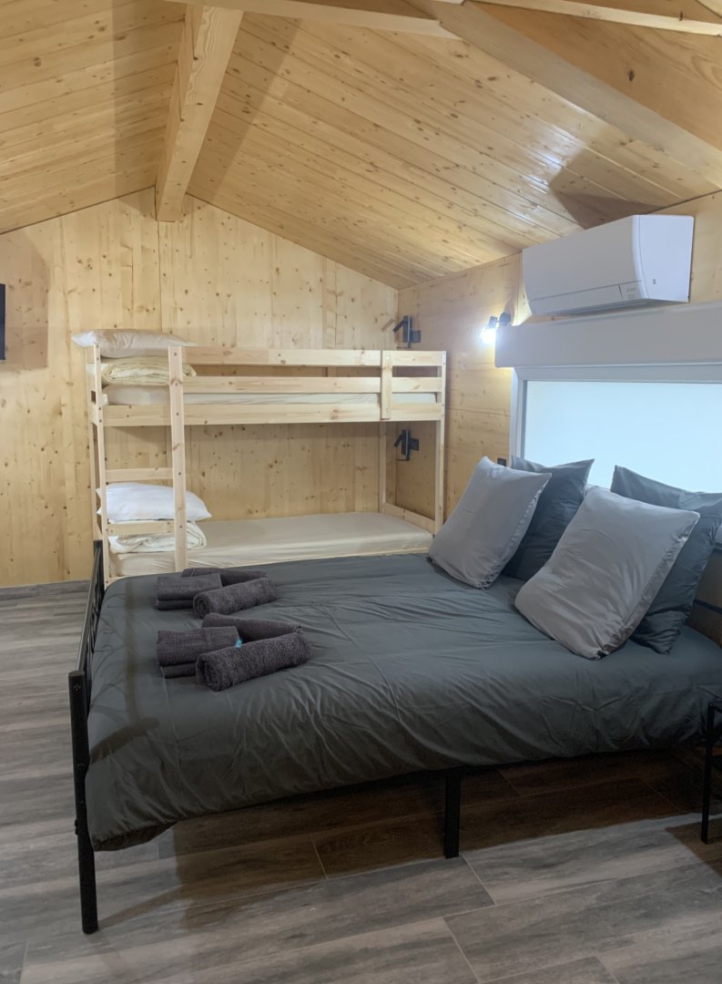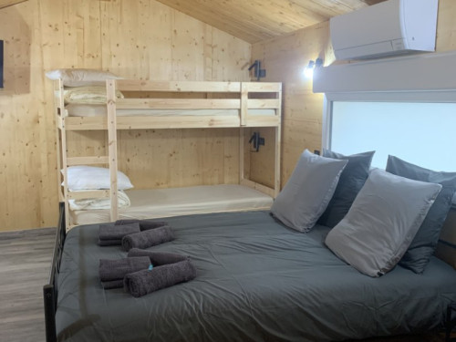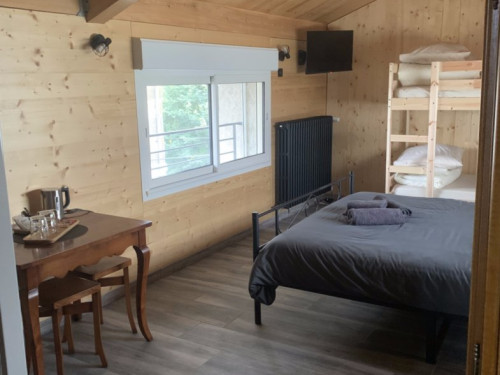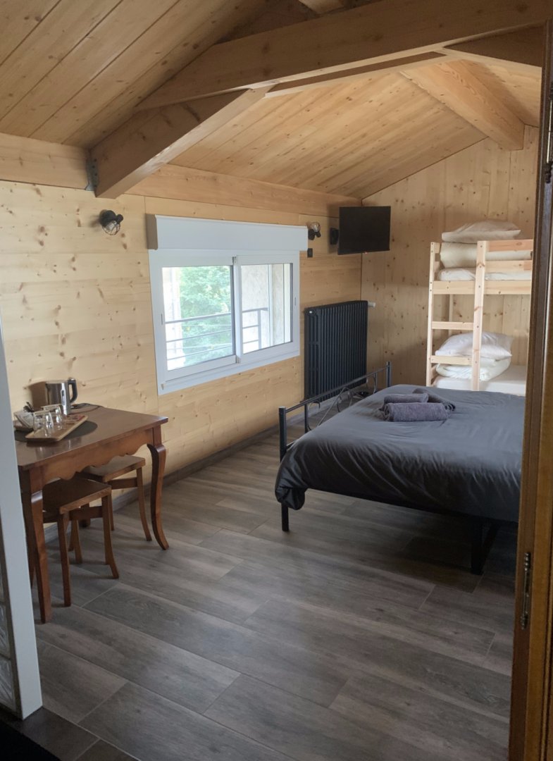 Chambre 4 : chambre familiale avec un lit de 160 cm et un lit superposé de 90 cm, salle de bain privative et la TV