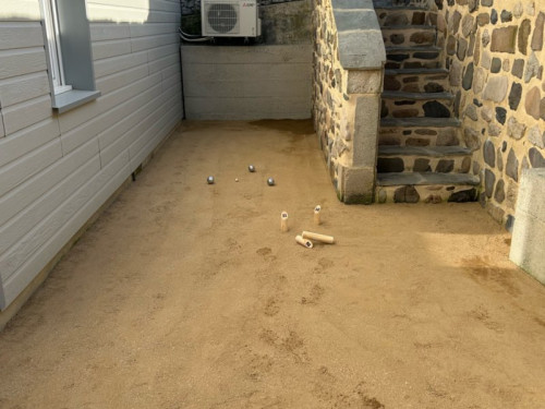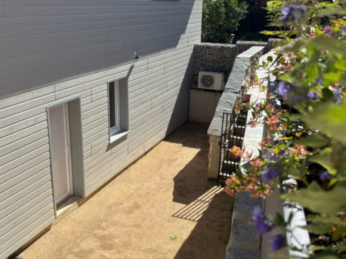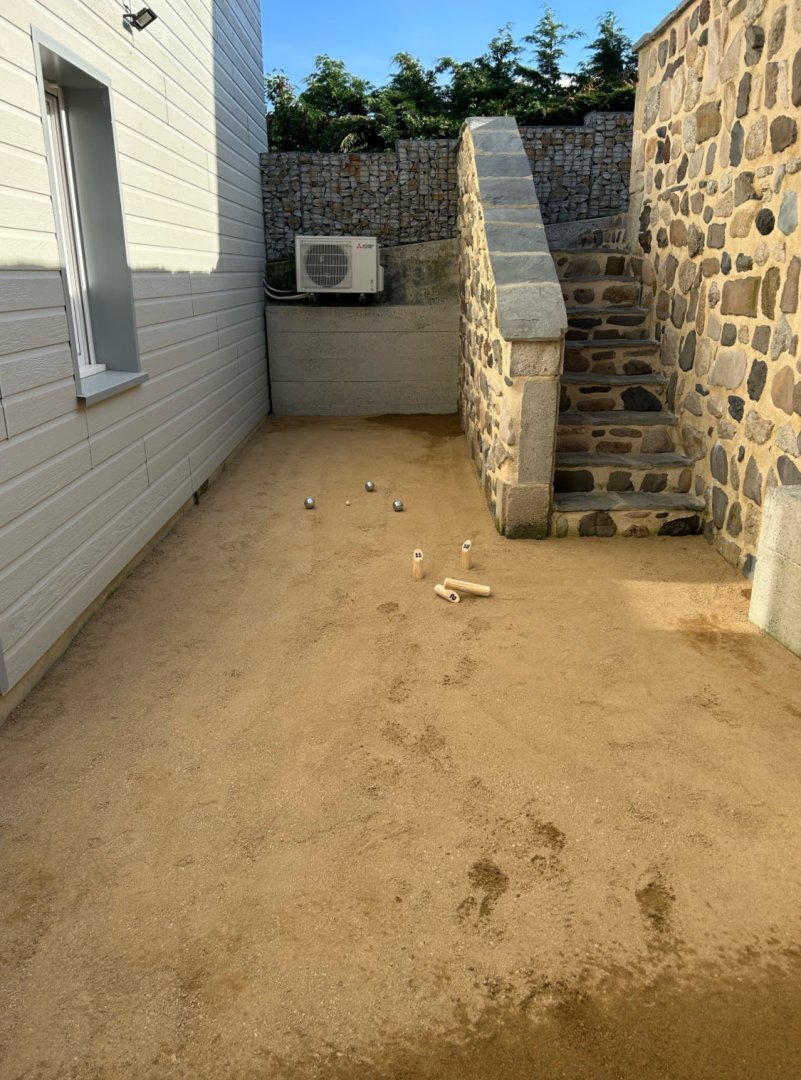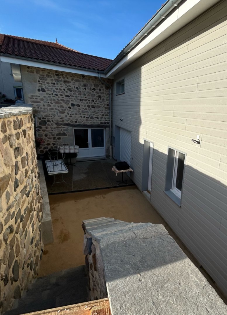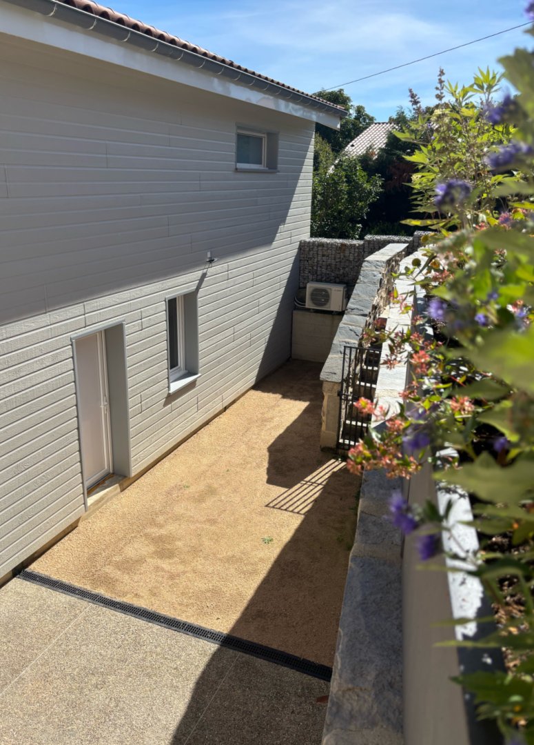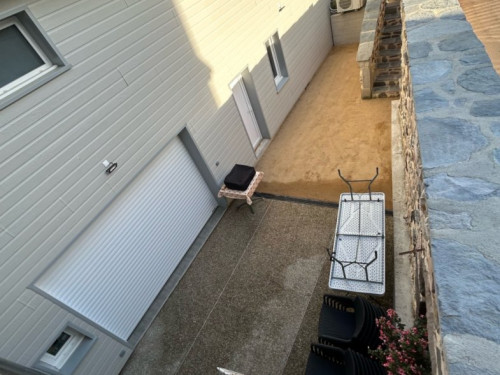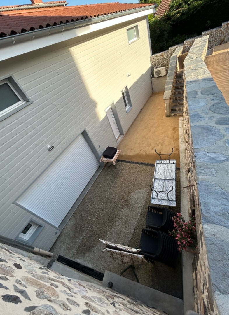 Une petite cour intérieure ensoleillée avec une plancha pour des repas en plein air.