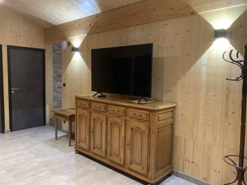 Un salon avec canapé, grande télévision connectée, livres et jeux de société sont à disposition pour des moments conviviaux en famille.