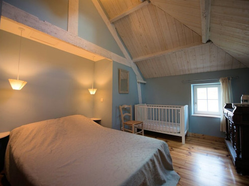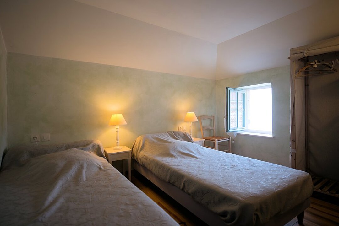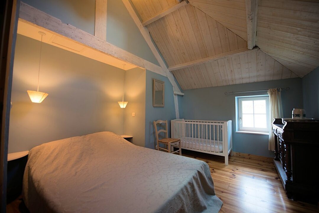 Deux chambres confortables, une avec un lit double et lit bébé et l’autre avec trois lits simples.