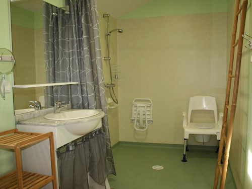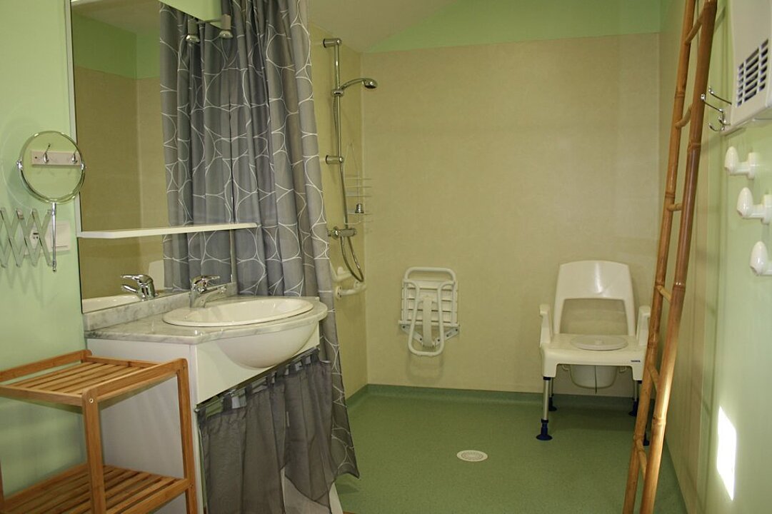 salle de bain à côté de la chambre, douche italienne, chaise de douche, WC surélevé, barres d’appui.