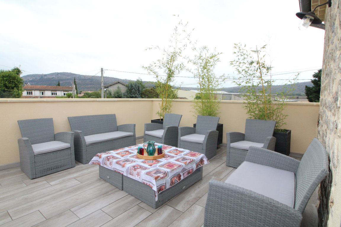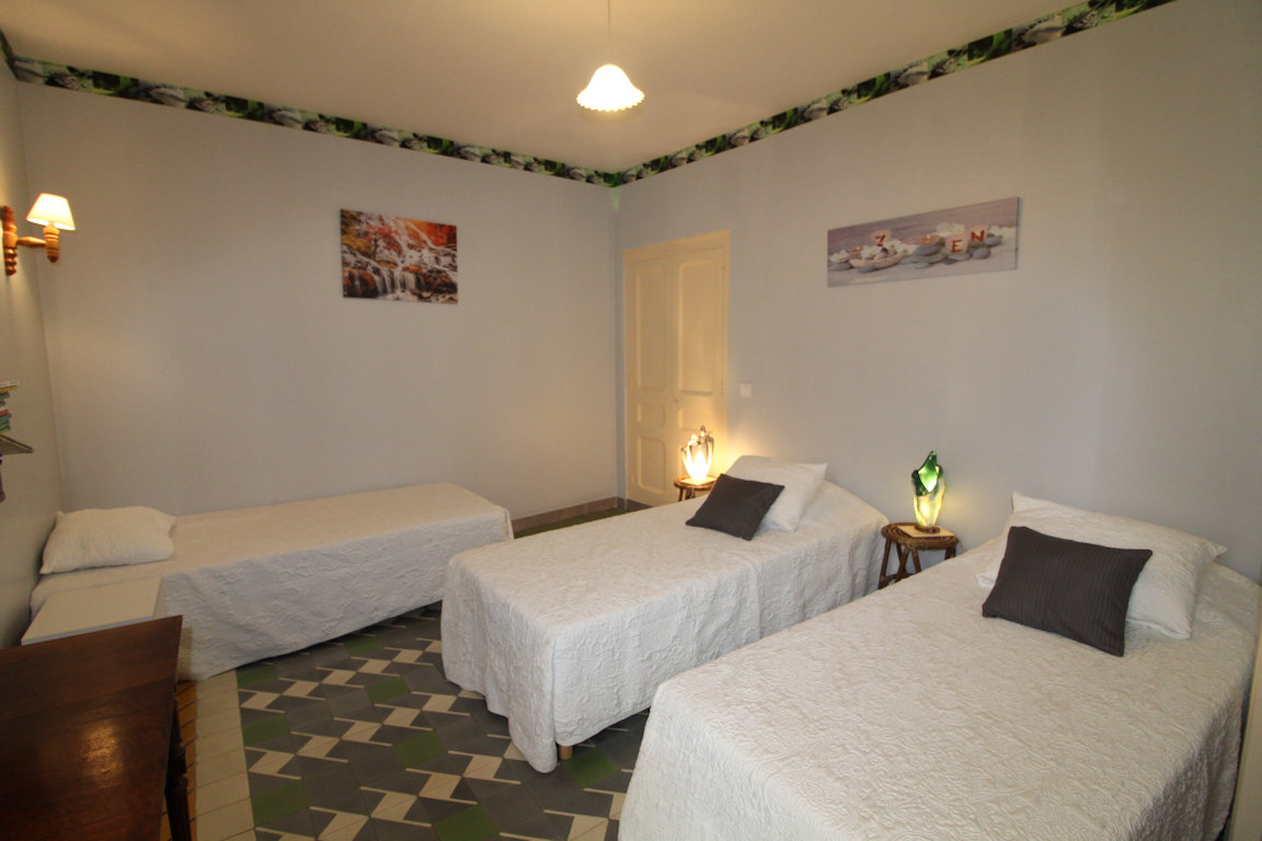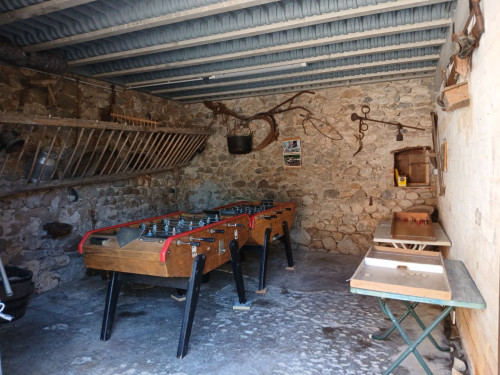 Une grande cour fermée où un imposant mûrier vous fera toute l'ombre nécessaire pour la détente. Une terrasse couverte avec coin repas avec barbecue et un coin détente. Un espace jeux avec 2 baby-foot et 1 table ping-pong et des jeux en bois pour enfants et adultes.