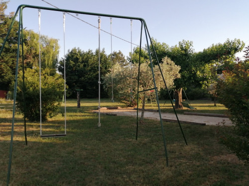 Parking extérieur avec aire de jeu (balançoire, toboggan, jeux de boule)