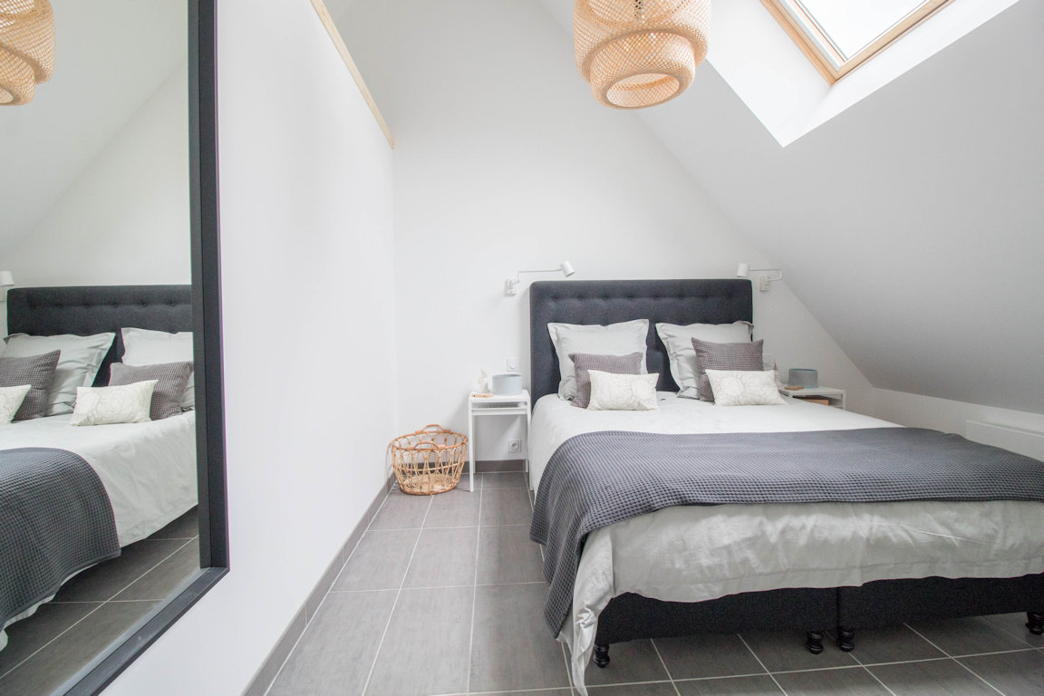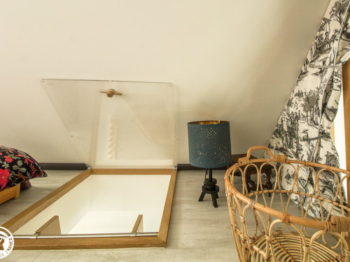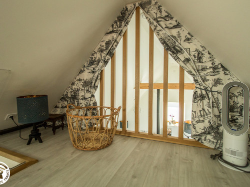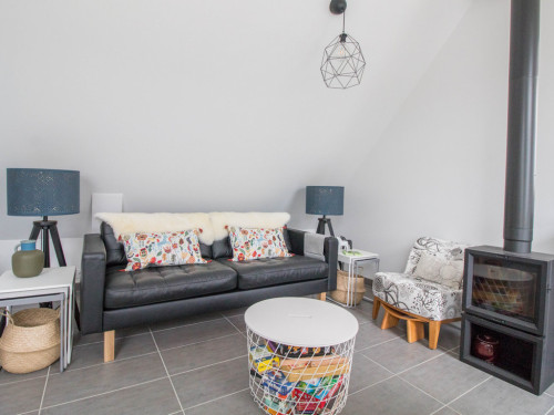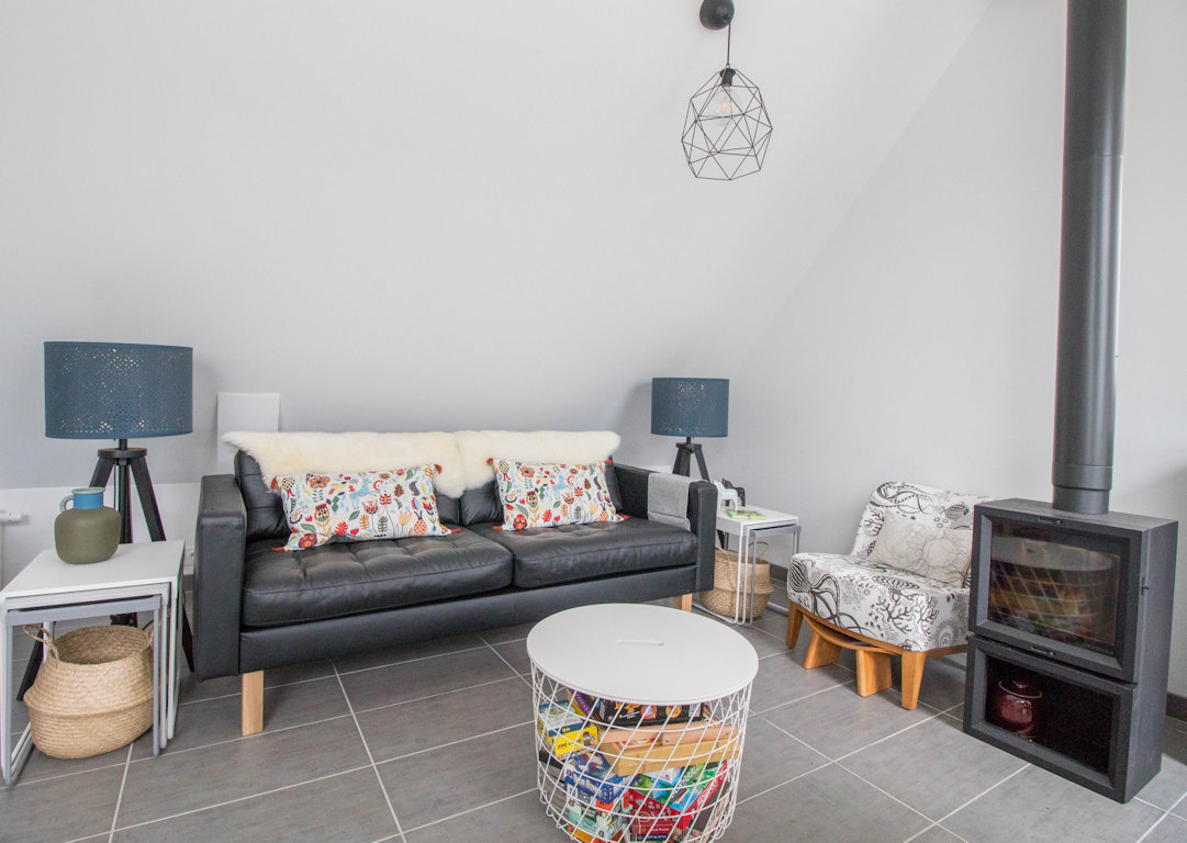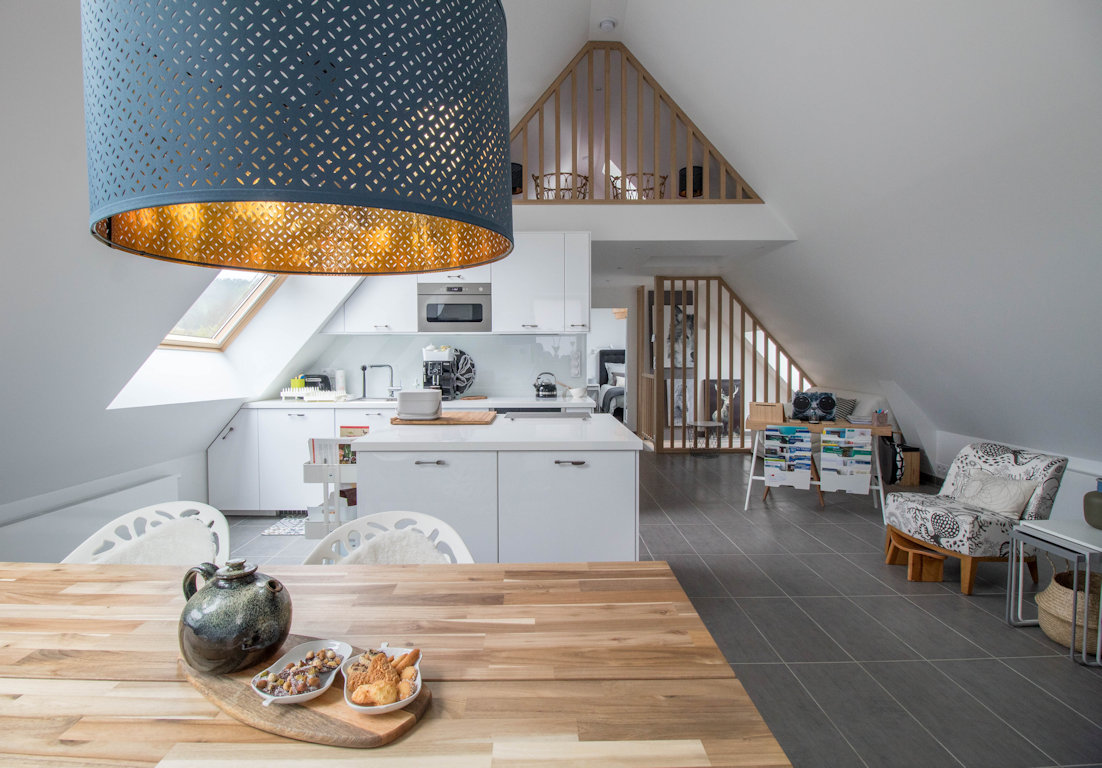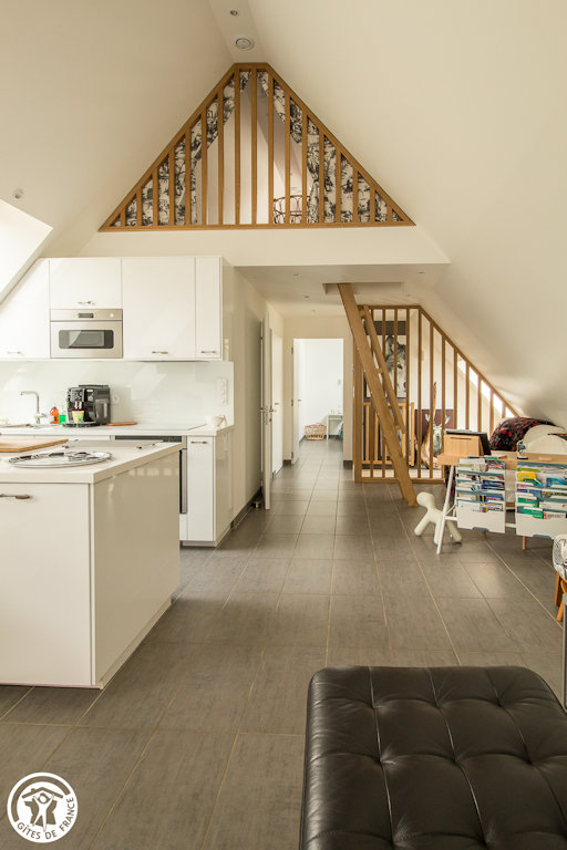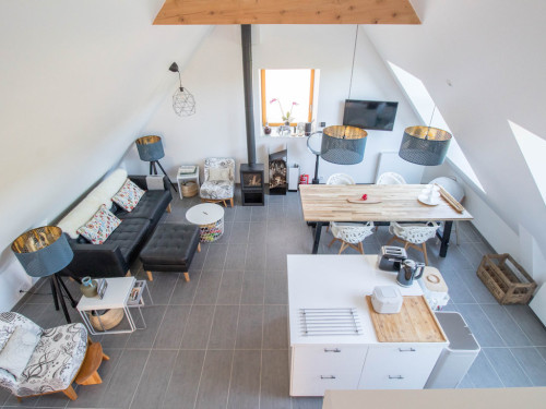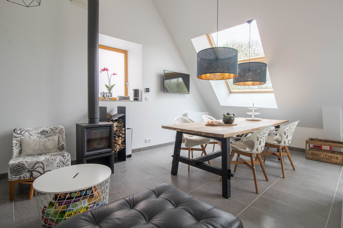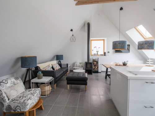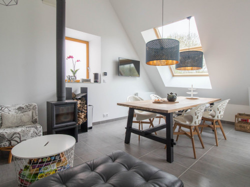 Au 1er étage : une grande et très lumineuse pièce de vie dans une ambiance moderne et chaleureuse comprenant un espace salon avec un poêle (bois inclus), un espace repas, une cuisine ouverte, un espace bureau connecté (WiFi, enceintes bluetooth), un canapé convertible avec un couchage de qualité ou une mezzanine, une salle d'eau, un wc indépendant, 1 chambre avec un lit de 160.