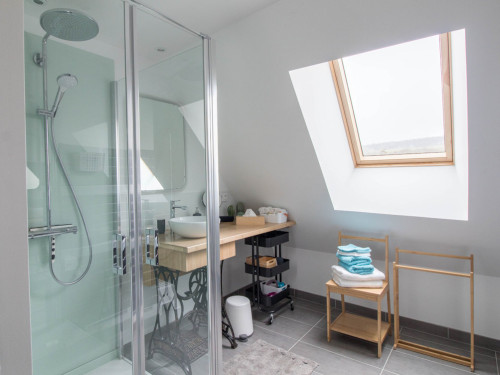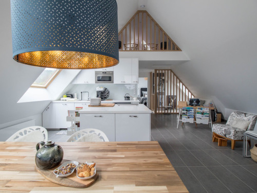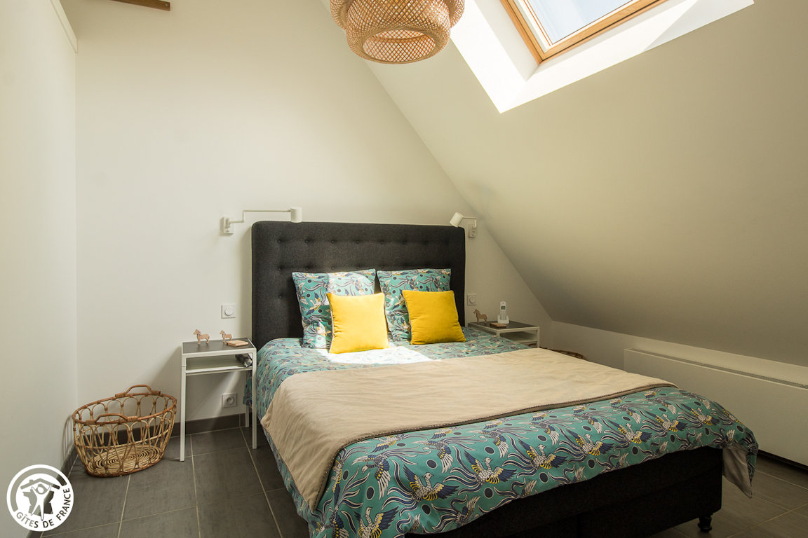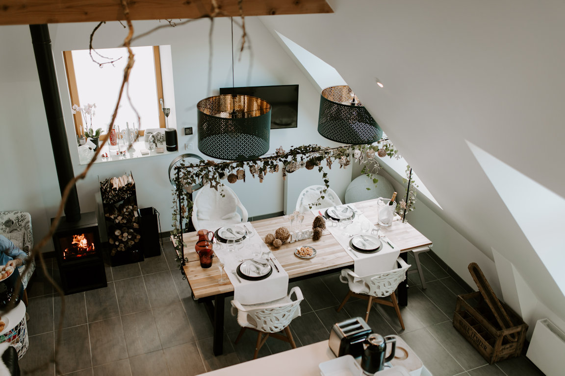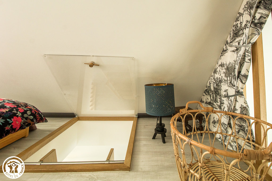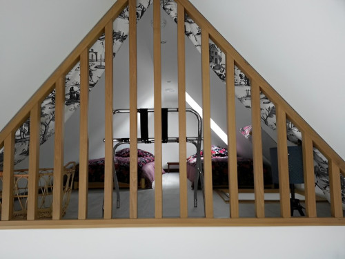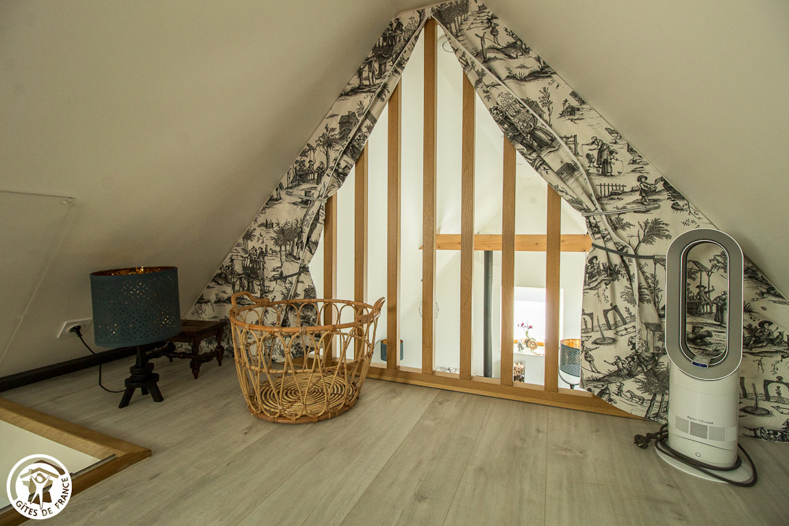 Au 1er étage : une grande et très lumineuse pièce de vie dans une ambiance moderne et chaleureuse comprenant un espace salon avec un poêle (bois inclus), un espace repas, une cuisine ouverte, un espace bureau connecté (WiFi, enceintes bluetooth), un canapé convertible avec un couchage de qualité ou une mezzanine, une salle d'eau, un wc indépendant, 1 chambre avec un lit de 160.