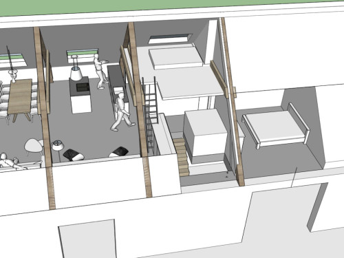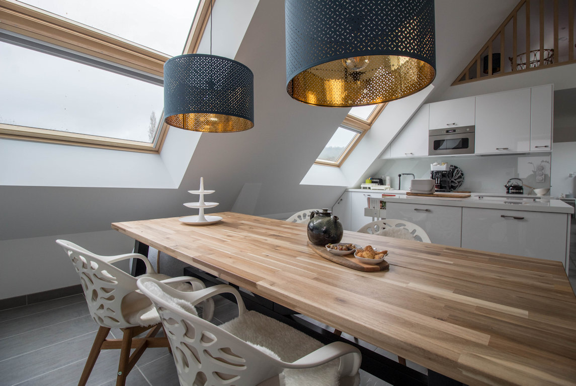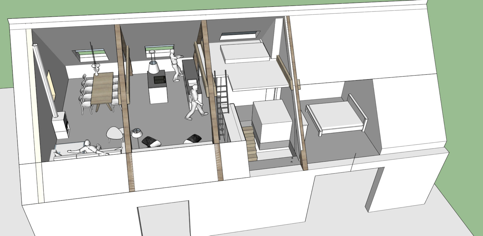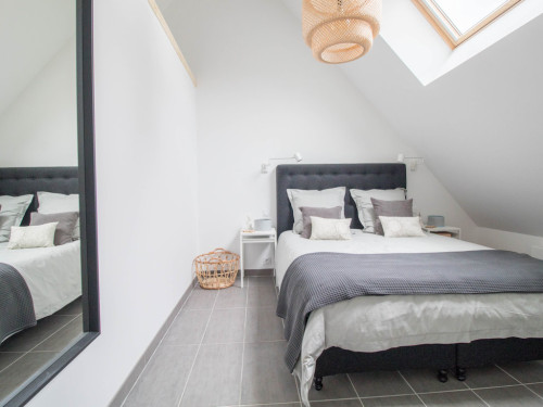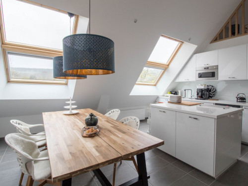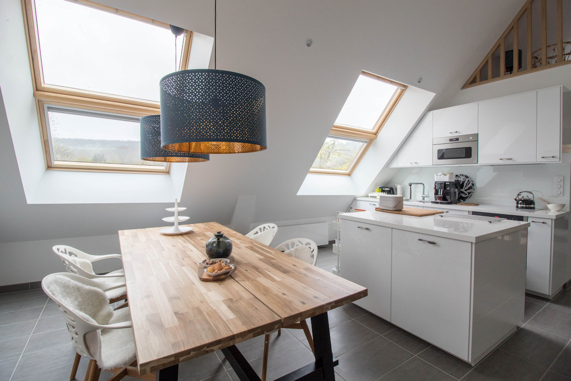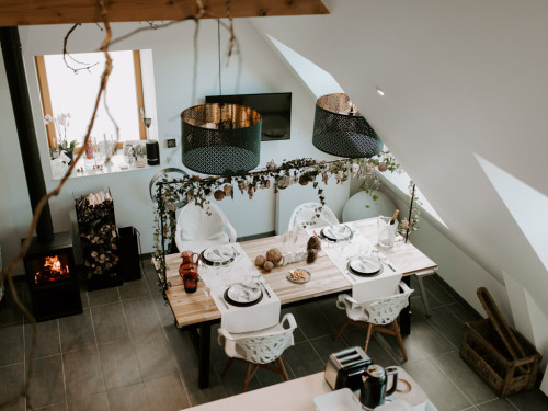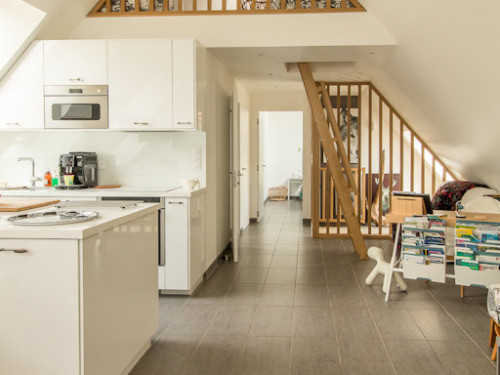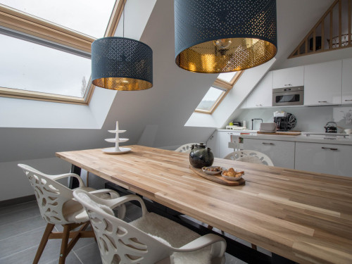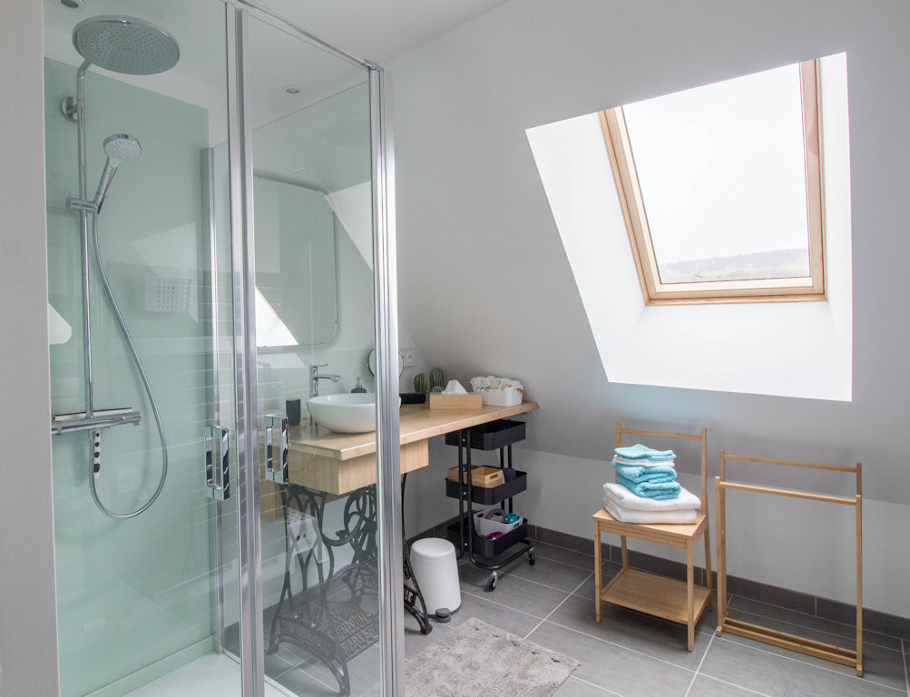 Au 1er étage : une grande et très lumineuse pièce de vie dans une ambiance moderne et chaleureuse comprenant un espace salon avec un poêle (bois inclus), un espace repas, une cuisine ouverte, un espace bureau connecté (WiFi, enceintes bluetooth), un canapé convertible avec un couchage de qualité ou une mezzanine, une salle d'eau, un wc indépendant, 1 chambre avec un lit de 160.