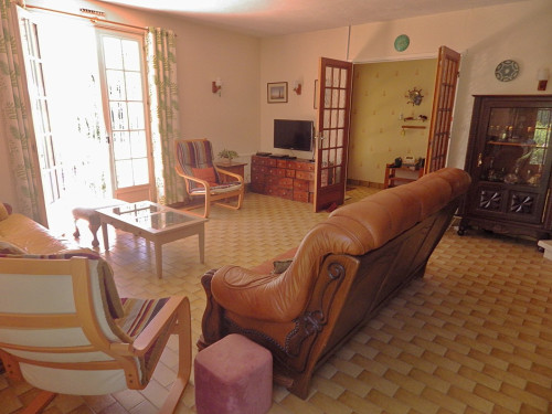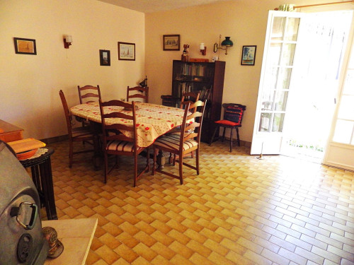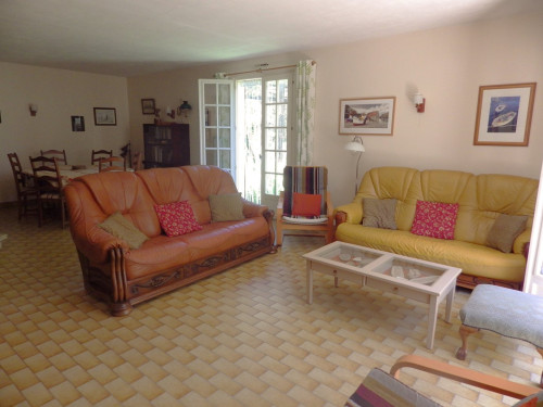Le salon / salle à manger décloisonné comprend une tables et des chaises pour 8 personnes, et s'ouvre directement sur le jardin.