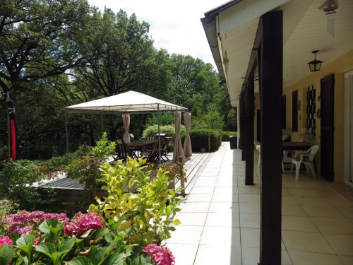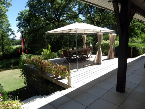 Une véranda couverte mène à une grande terrasse surélevée, dotée d'une clôture de sécurité pour enfants et de marches menant au jardin avec une barrière de sécurité pour enfants (si demandé), une table et des sièges pour 8 personnes.