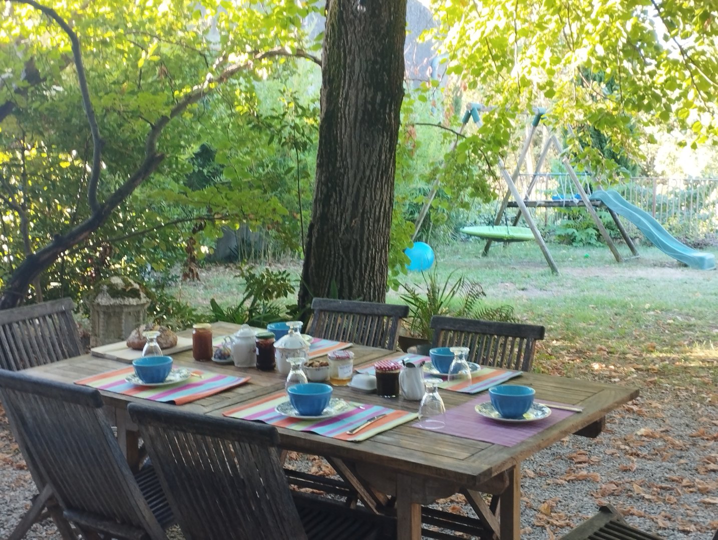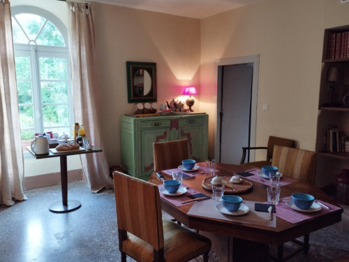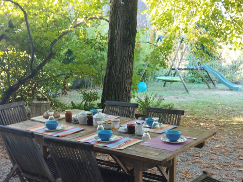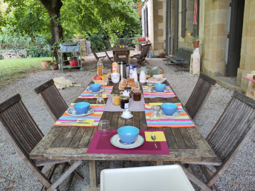 Pour les chambre d'hôtes, un petit déjeuner compris dans le tarif vous sera servi dans le salon ou sous les tilleuls du jardin.