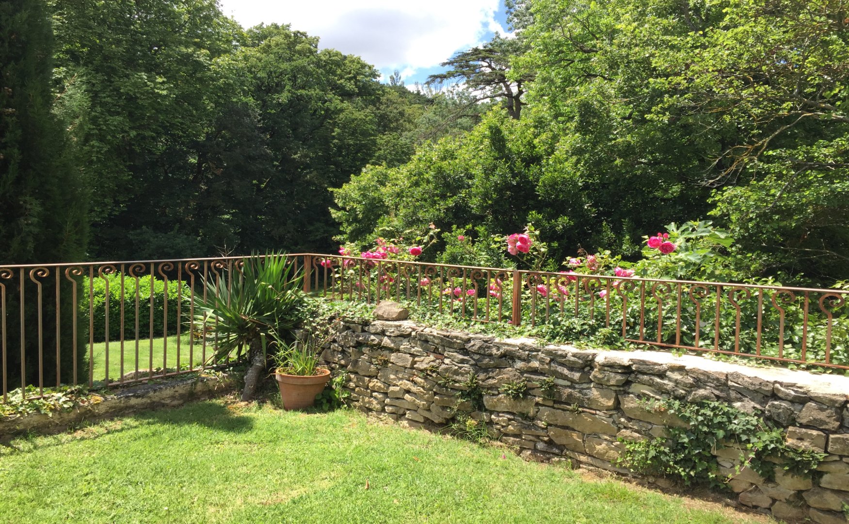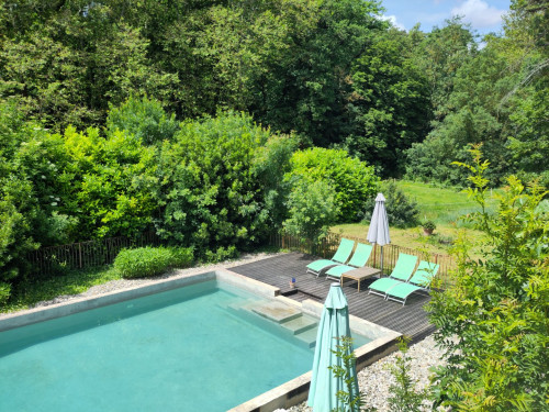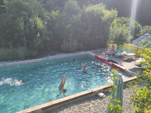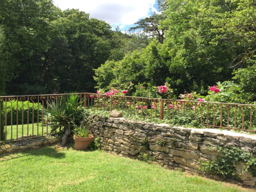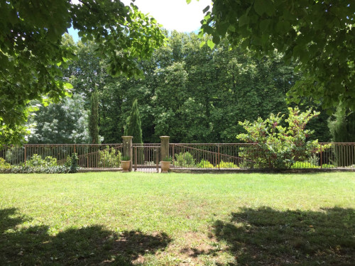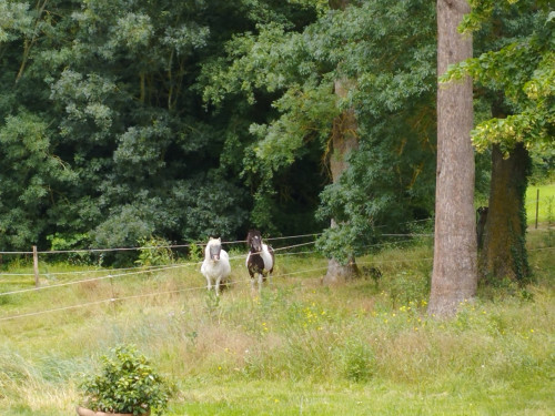 À l'extérieur un vaste jardin clos avec portique de jeux et tilleuls centenaires ; une grande piscine salée (14 x 7 m), baby-foot, ping-pong. Deux petites ponettes, un cheval et un chien sont les princes et princesses du château.