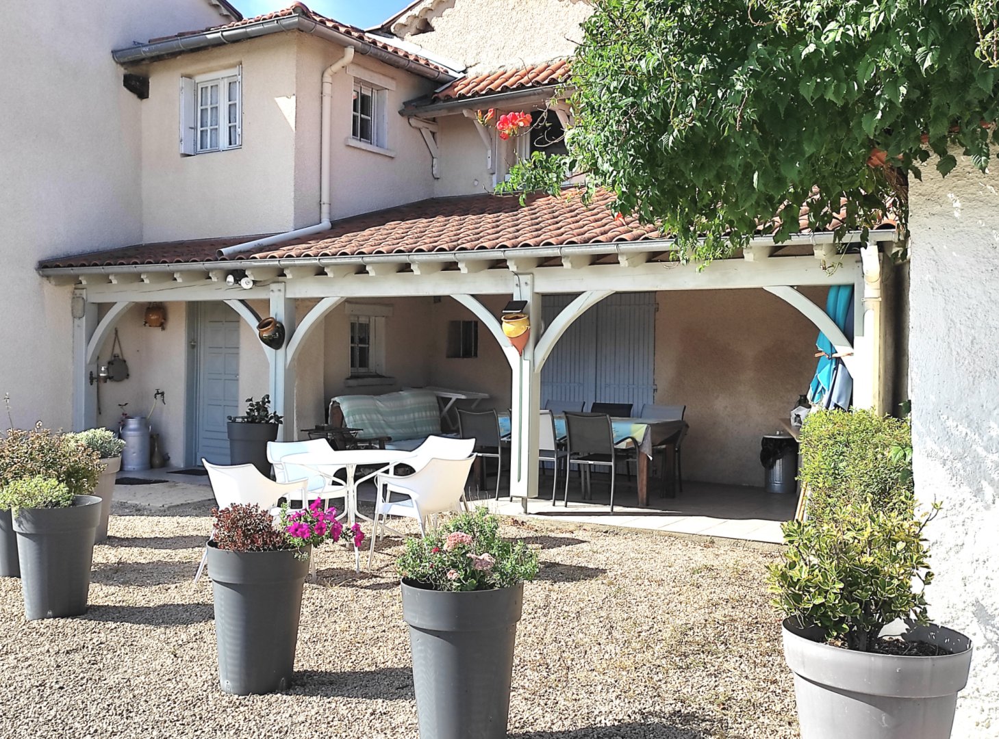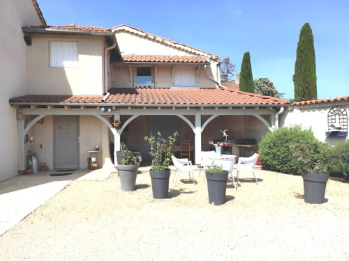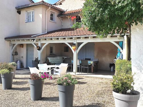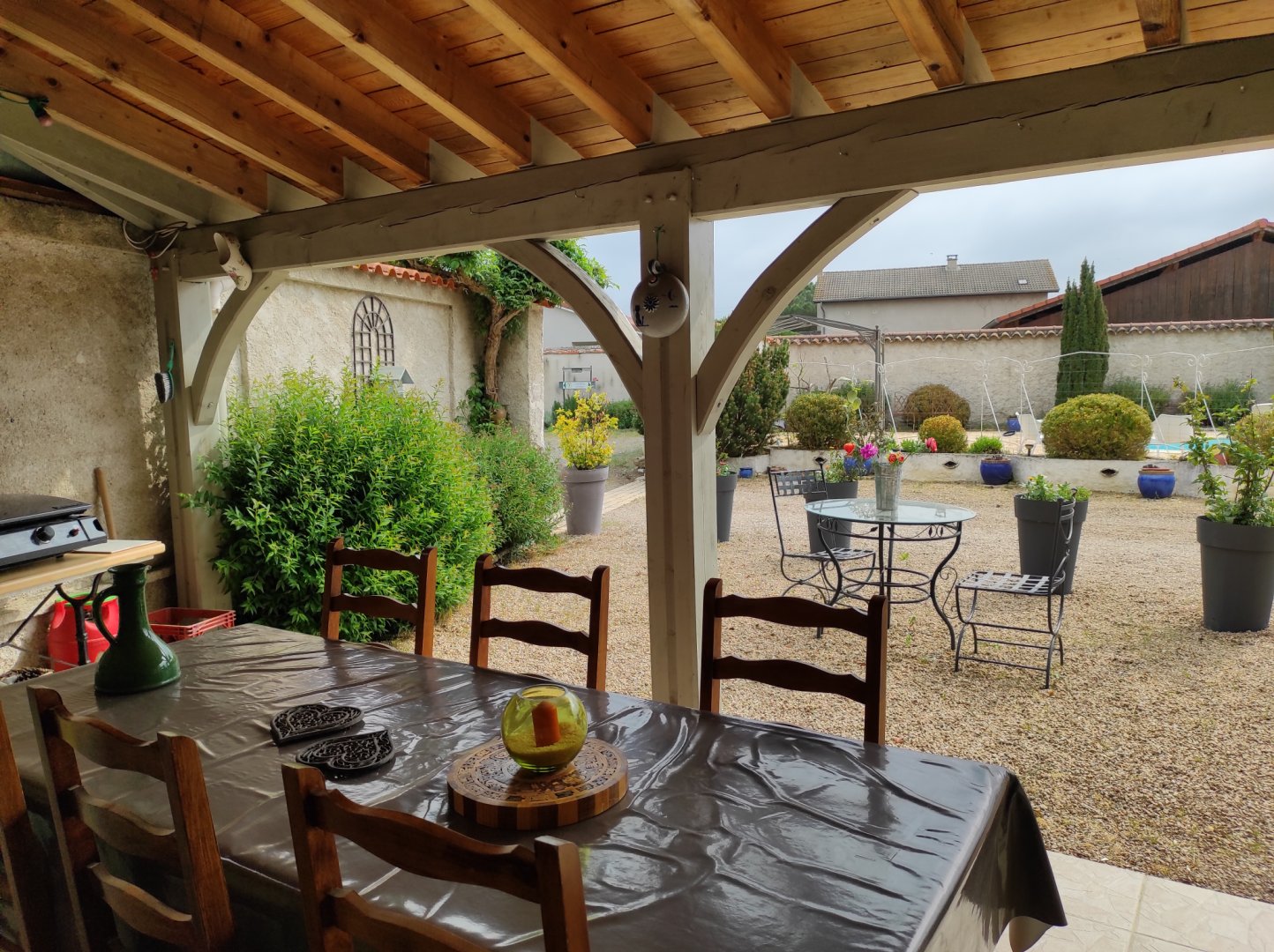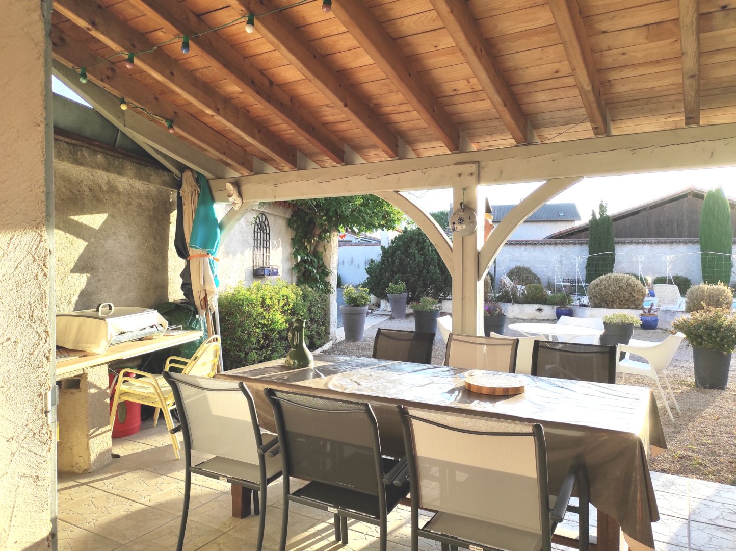 Accès terrasse privée couverte avec table chaises et plancha.