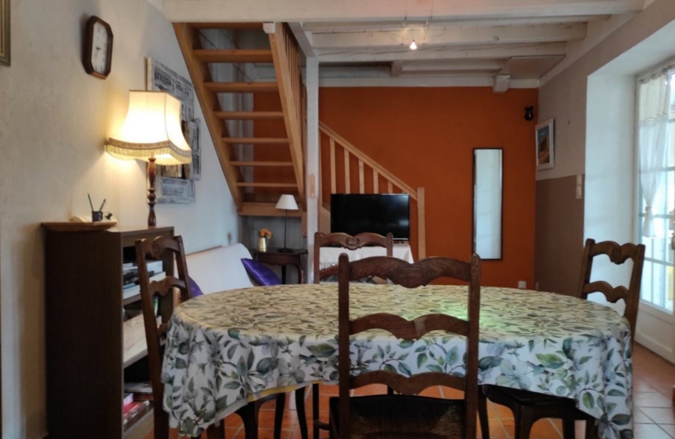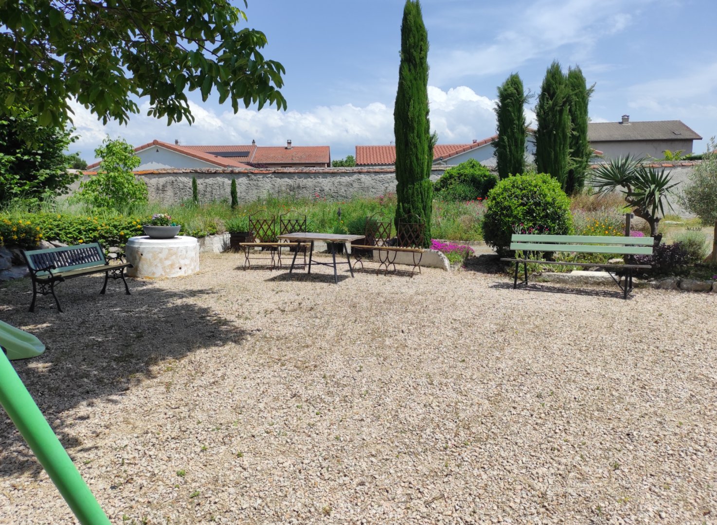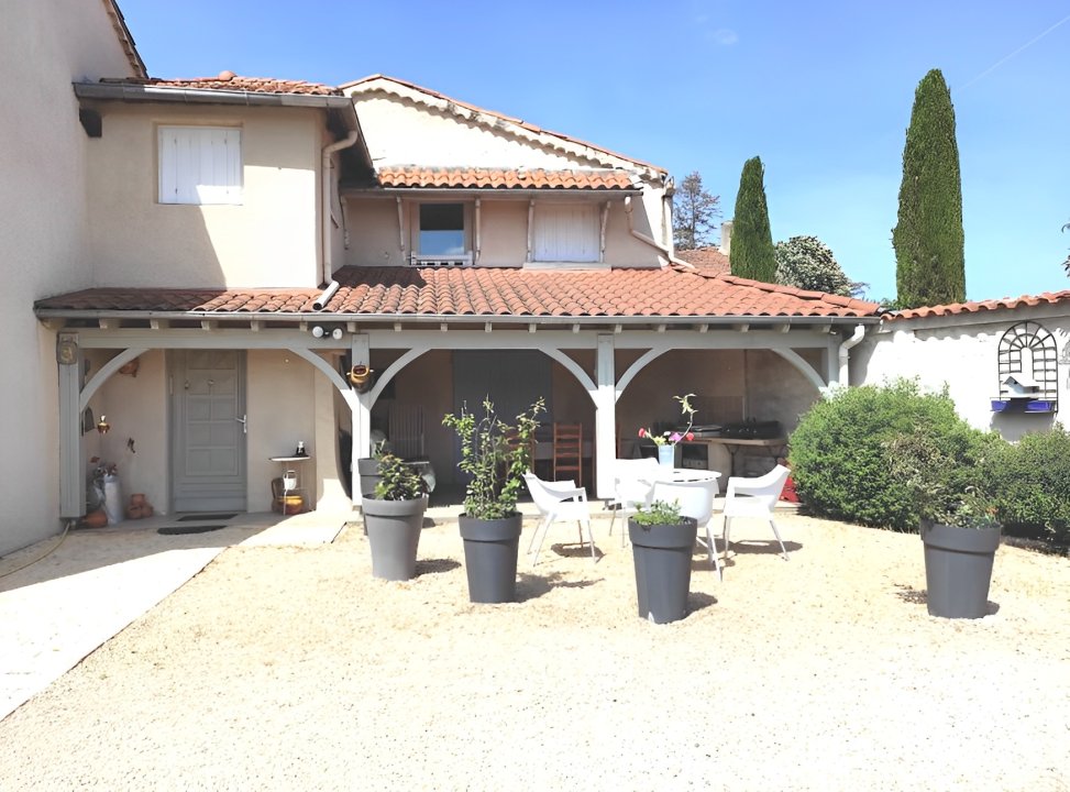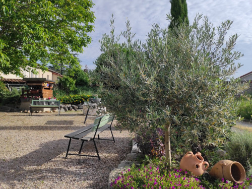 Accès terrasse privée couverte avec table chaises et plancha.