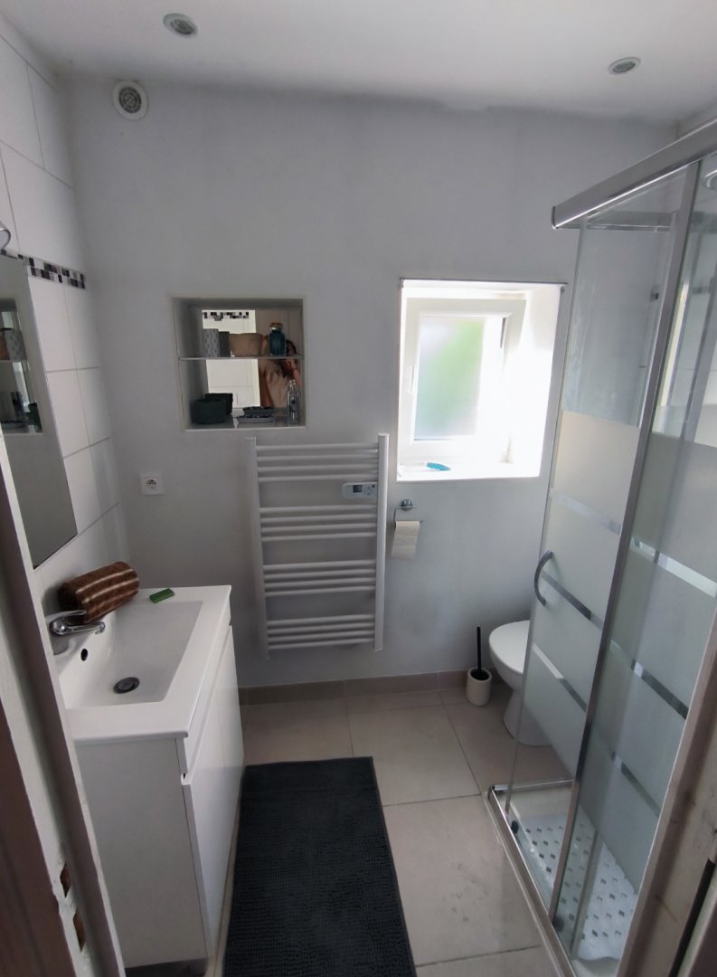À l’étage, vous trouverez une chambre spacieuse avec grand placard de rangement et d’une salle d’eau avec douche et WC. Vous bénéficierez, par ailleurs, d’une petite terrasse pour prendre le soleil et, également, d’une terrasse avec table et 2 chaises pour manger à l’extérieur au rez-de-chaussée.