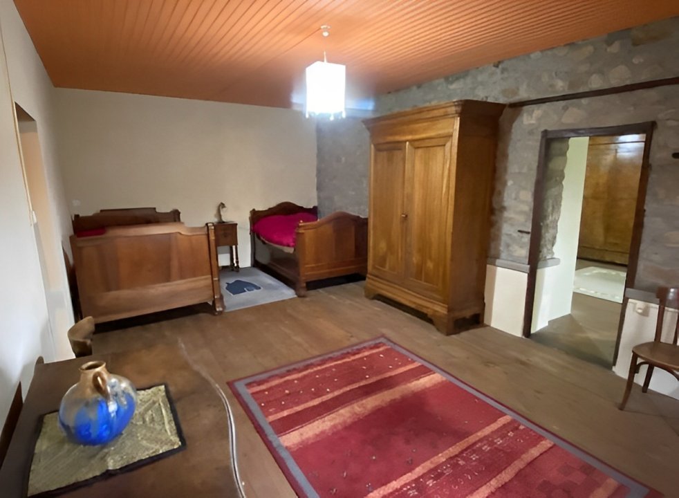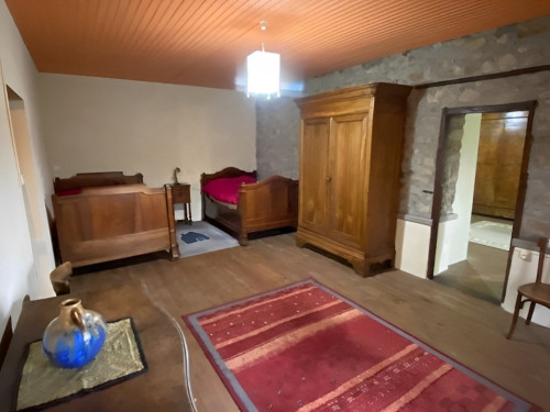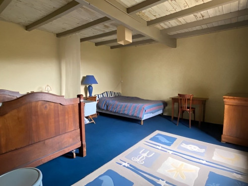- Une chambre communicante avec 2 lits doubles à rouleaux en bois massif (120 cm large) et oreillers, chevet avec lampe de chevet, tapis, une armoire en bois massif, une armoire avec tiroirs en bois peint en vert, fauteuil et chaises, tapis sur sol plancher et vue sur le jardin sud-est