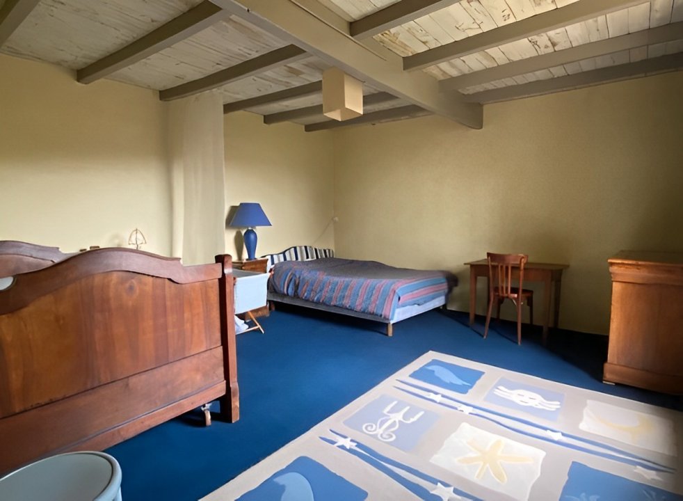 - 1 chambre « bleue » avec 2 lits doubles et oreillers + lit de bébé, chevet, lampes, portant à vêtements, tapis et chaises – vue sur le jardin sud-est