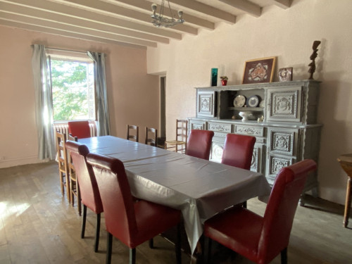 - 1 salle à manger avec une table en bois massif recouverte d’une nappe grise, un buffet en bois peint avec la vaisselle, une armoire en bois massif, 6 chaises en cuir rouge, 6 chaises en bois paillées, une seconde table bois massif, sol plancher – vue sur le jardin sud-est