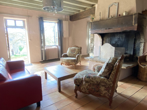 - 1 salon avec cheminée chenets et pare-feu, 2 canapés rouge et plaids, 2 fauteuils en tissus, 1 table de salon en bois massif, 1 table bout de canapé en bois massif, 1 chaîne HIFI, 1 console en bois massif et 1 piano en bois, sol carrelé – vue sur le jardin sud est