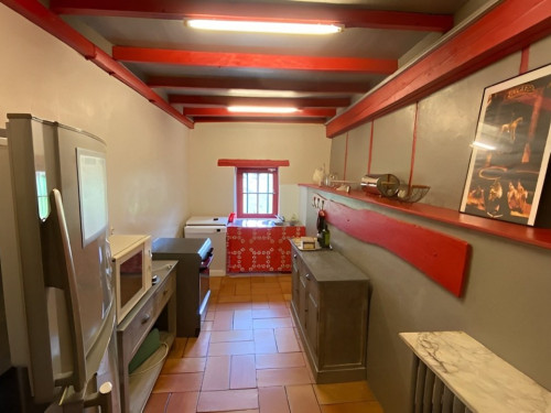 - Une salle d’activité pouvant être transformée en lieu de couchage d’appoint en cas de besoin avec meubles de rangement, canapé/lit en tissu, 3 luminaires, table basse, 1 aspirateur et une ancienne machine à coudre – sol plancher recouvert de coco et petite fenêtre basse donnant sur le jardin sud-est
