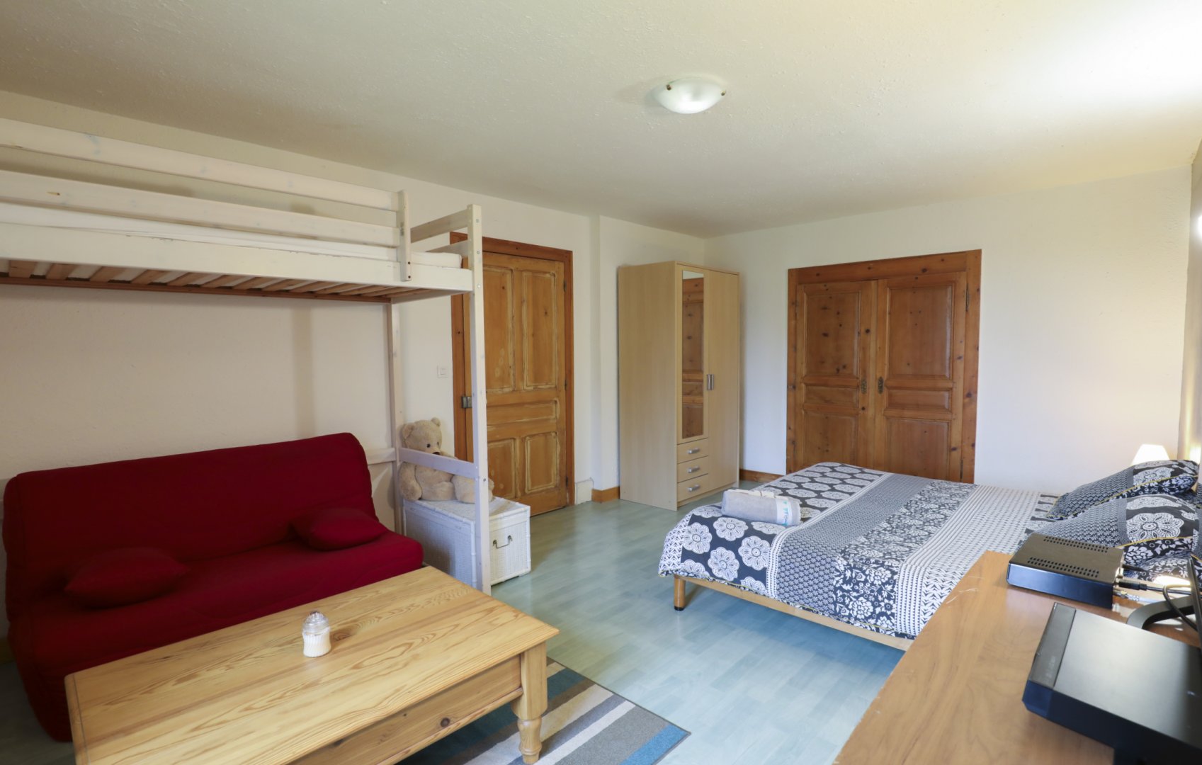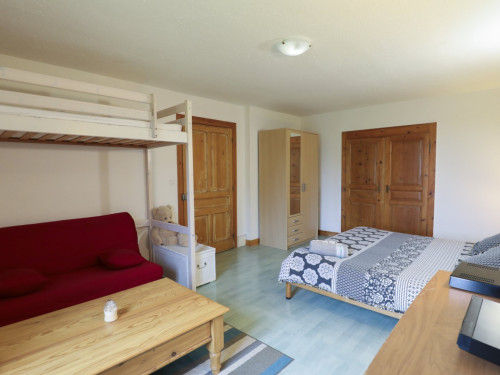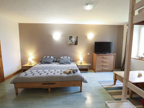Au 1er étage, 1 chambre de 5.50 m sur 3.80 m, avec 1 grand lit double + 1 mezzanine avec au-dessus 1 petit lit, et en dessous un canapé-lit (BZ), grand confort, et 1 cuisine de 4.40 m sur 3.70 m, aménagée, et toute équipée, et entre les deux pièces WC/salle de bain avec douche.