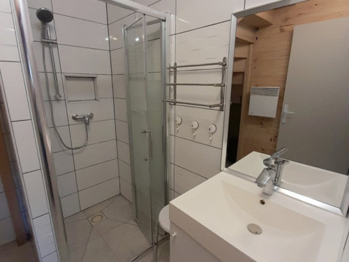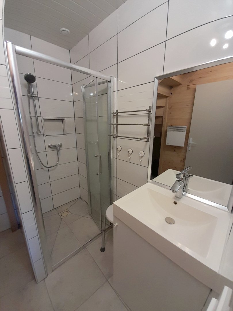 • Au RDC : 1 grande pièce à vivre de 30 m² avec cuisine toute équipée, coin salon, TV, Wifi, 1 canapé clic-clac en 140 + 1 fauteuil + 1 salle d'eau avec douche italienne et WC