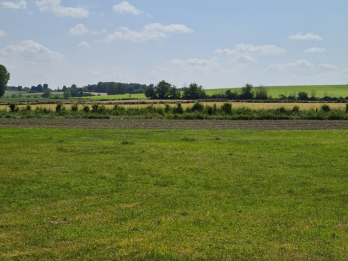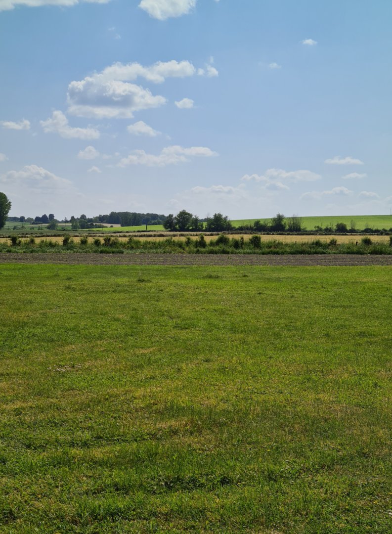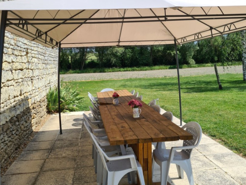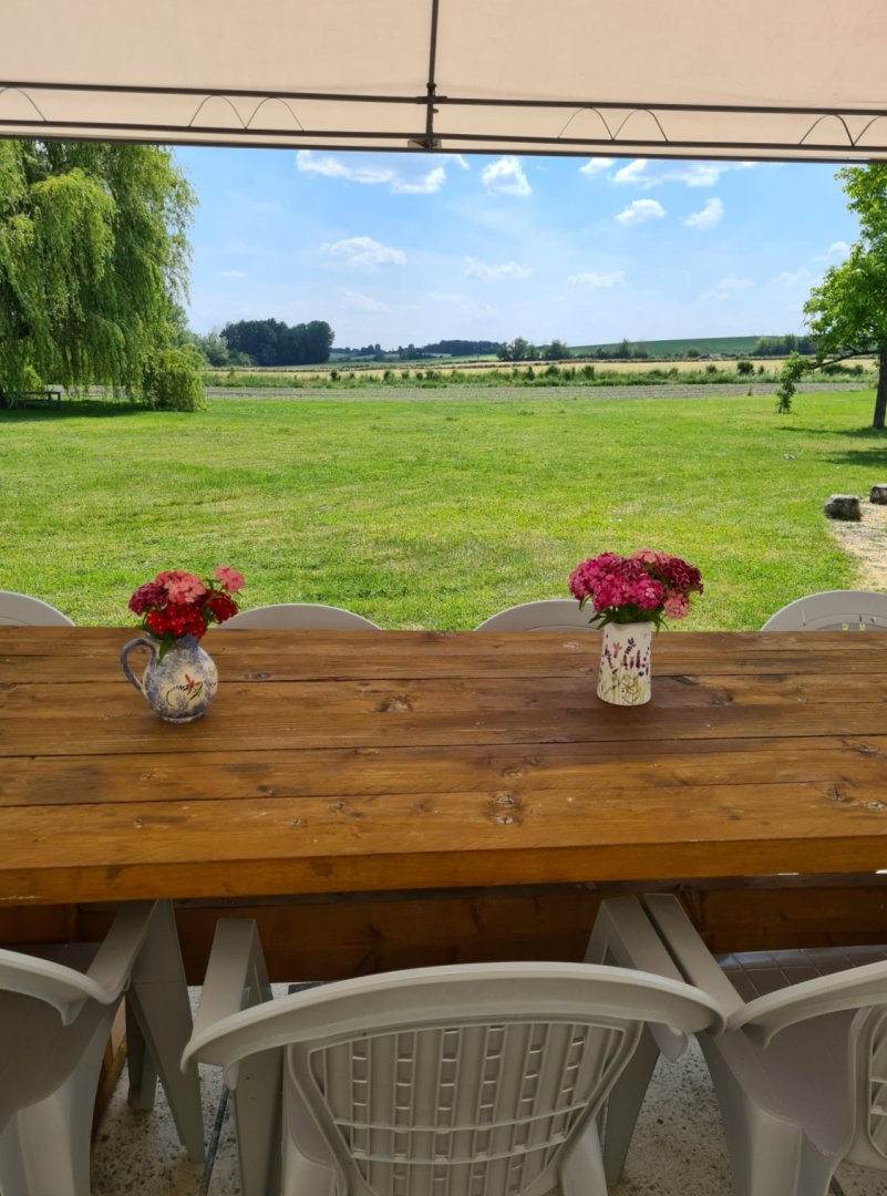 Espace vert de 2500 m² avec une aire gravillonnée, barbecue, salons de jardin. Vue panoramique sur campagne environnante.