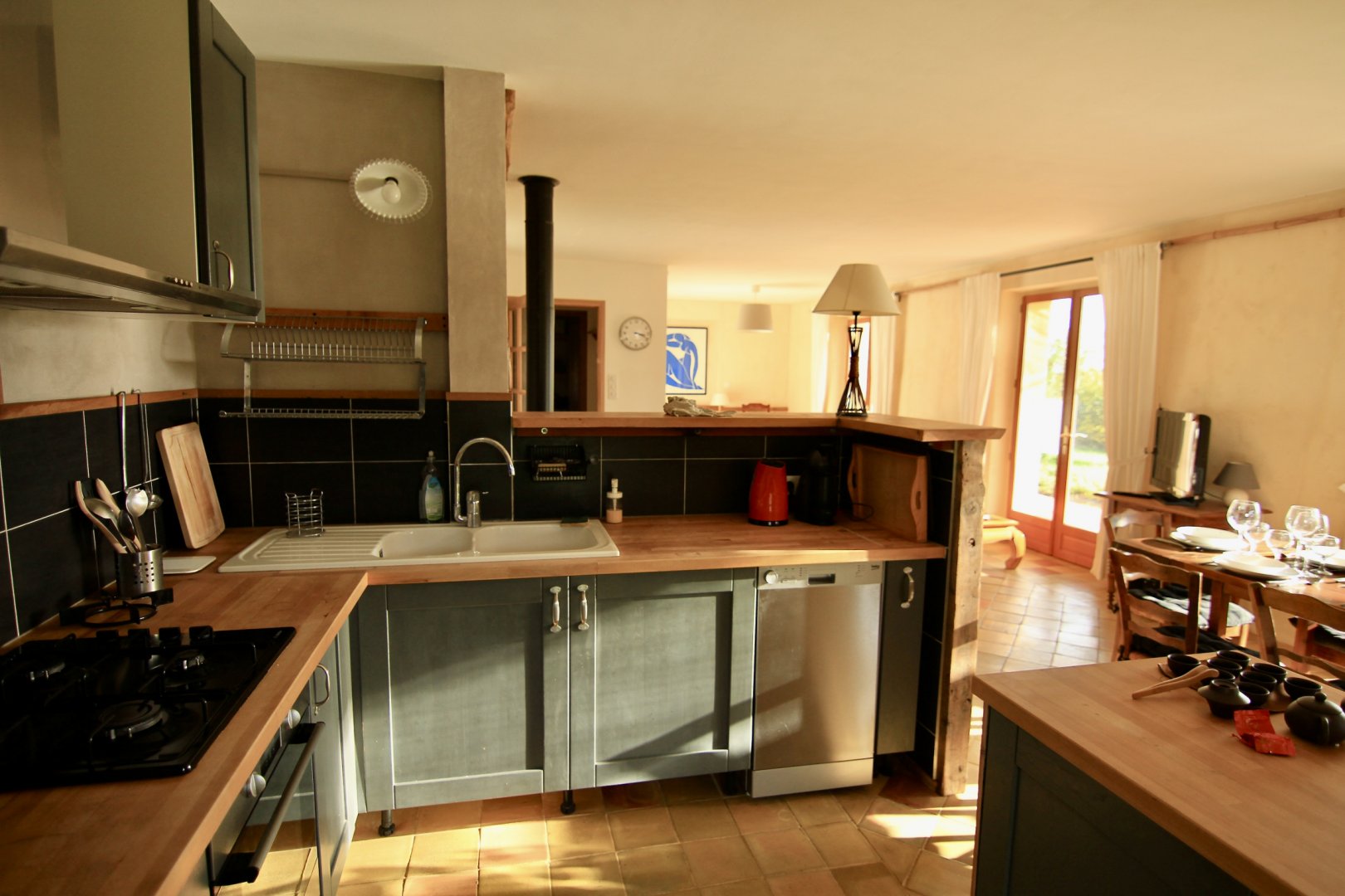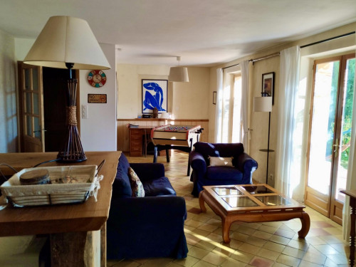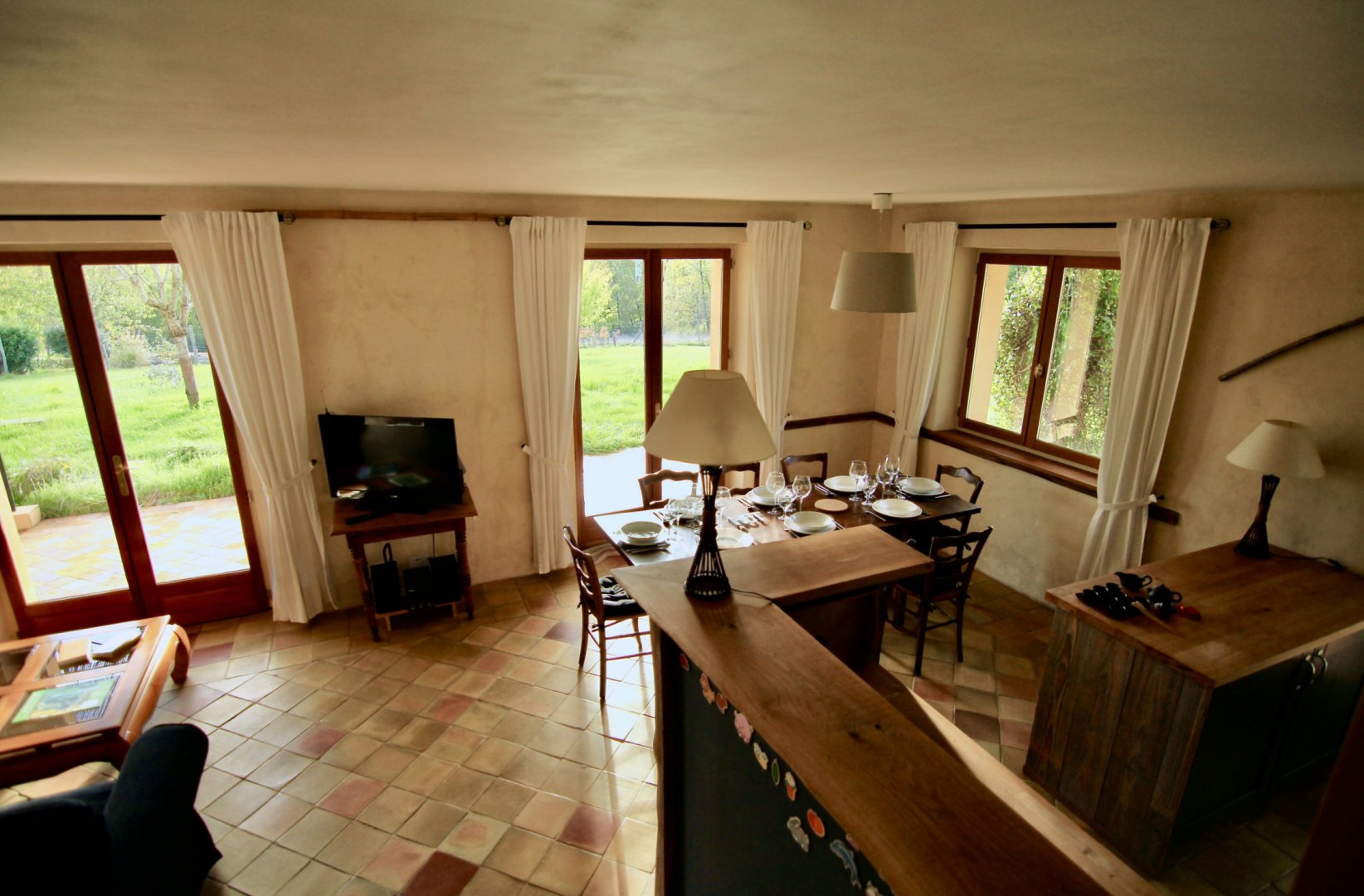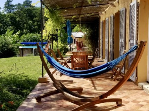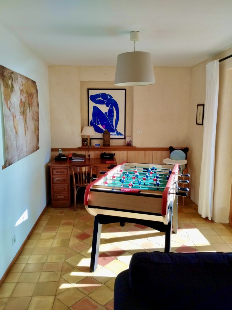 Le salon, le coin repas, la cuisine américaine, le bureau et un vrai baby-foot se trouvent au rez-de-chaussée. Il s'ouvre au sud et à l'ouest sur le jardin. Vous profiterez d'une vaste terrasse de terres cuites artisanales aux tons chauds, ombragée par une pergola entièrement recouverte de canisses et en partie végétalisée (glycine, chèvrefeuille, akebia). Un salon de jardin en teck vous invite à des repas conviviaux. Les chambres (avec moustiquaires et rafraichies par des ventilateurs) et la salle de bain sont à l’étage.