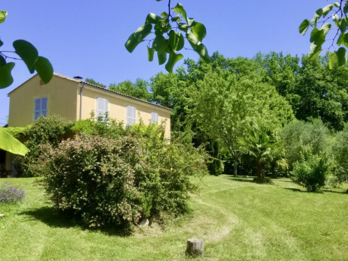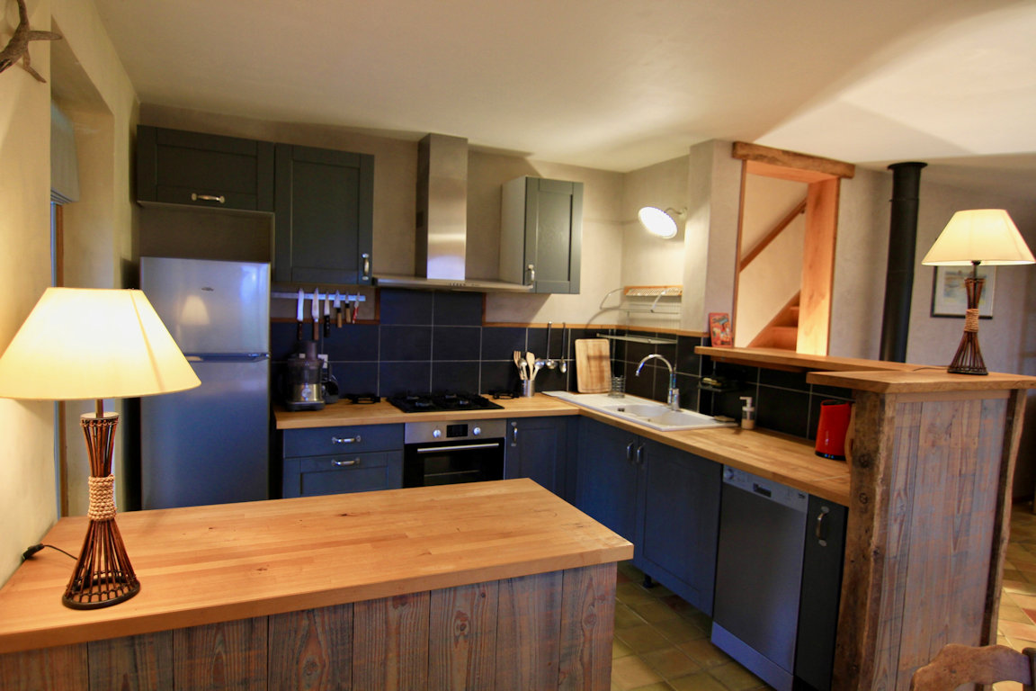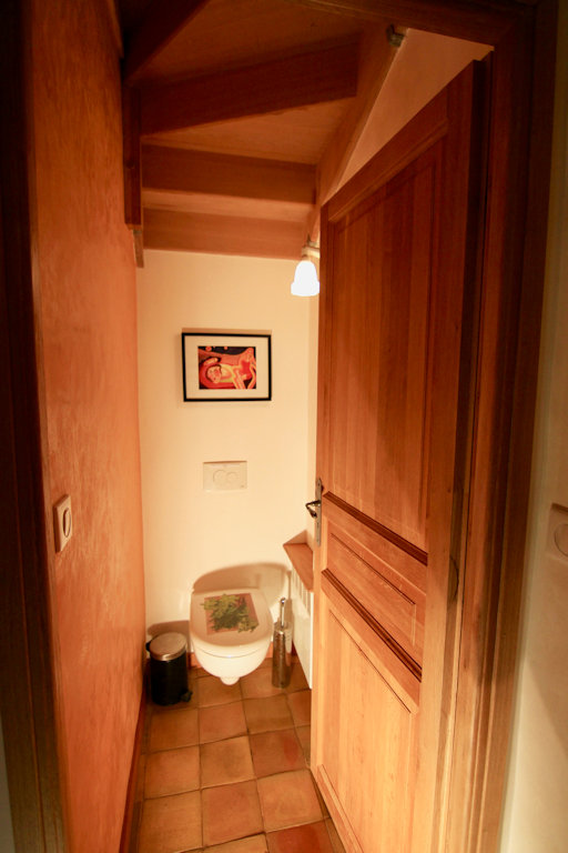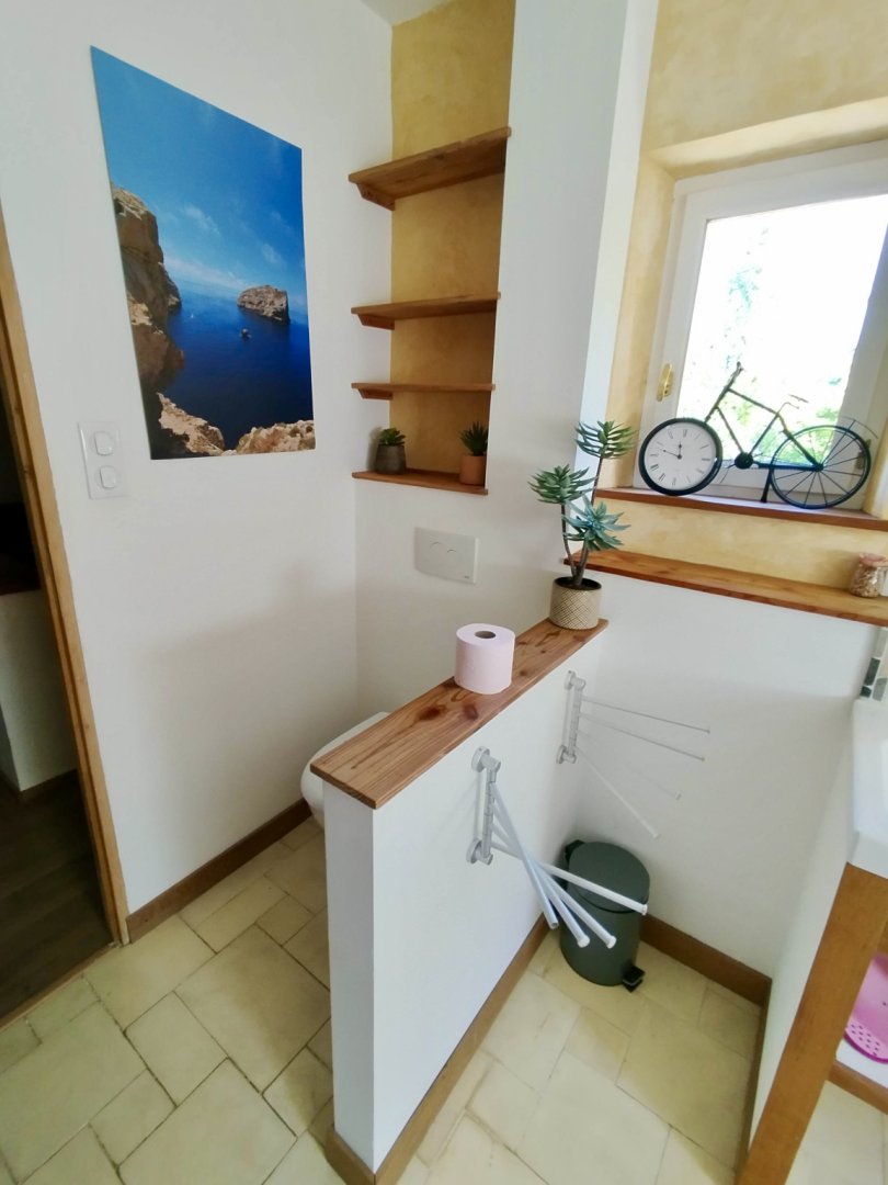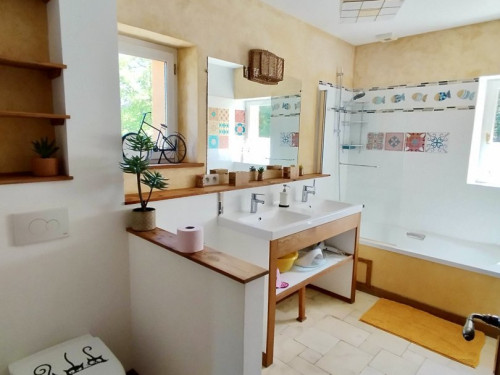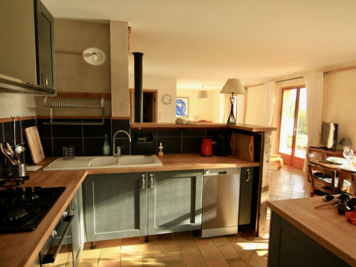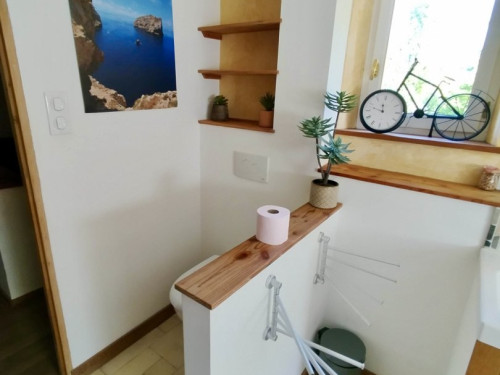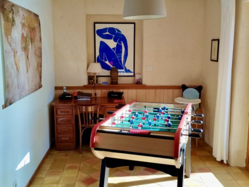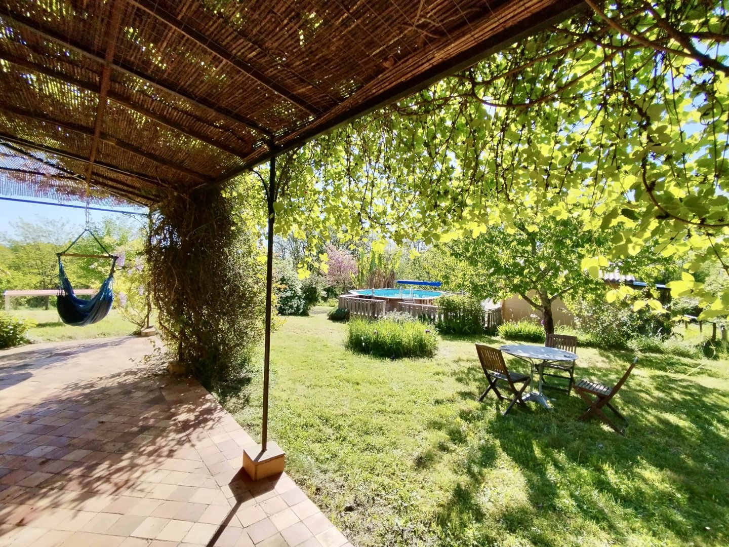 Le salon, le coin repas, la cuisine américaine, le bureau et un vrai baby-foot se trouvent au rez-de-chaussée. Il s'ouvre au sud et à l'ouest sur le jardin. Vous profiterez d'une vaste terrasse de terres cuites artisanales aux tons chauds, ombragée par une pergola entièrement recouverte de canisses et en partie végétalisée (glycine, chèvrefeuille, akebia). Un salon de jardin en teck vous invite à des repas conviviaux. Les chambres (avec moustiquaires et rafraichies par des ventilateurs) et la salle de bain sont à l’étage.