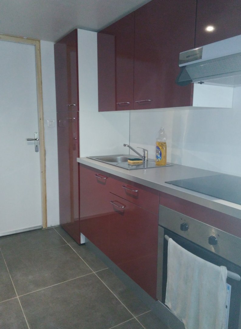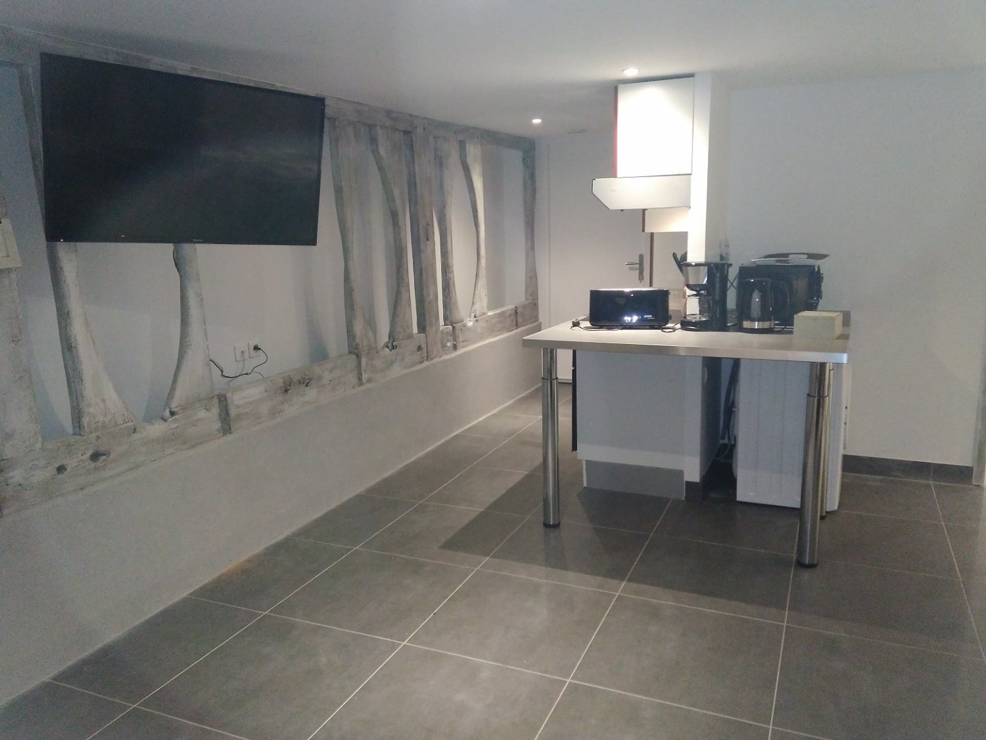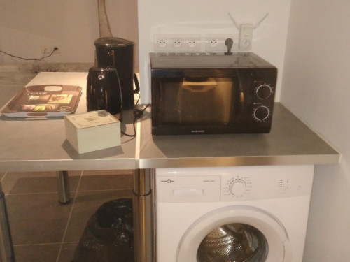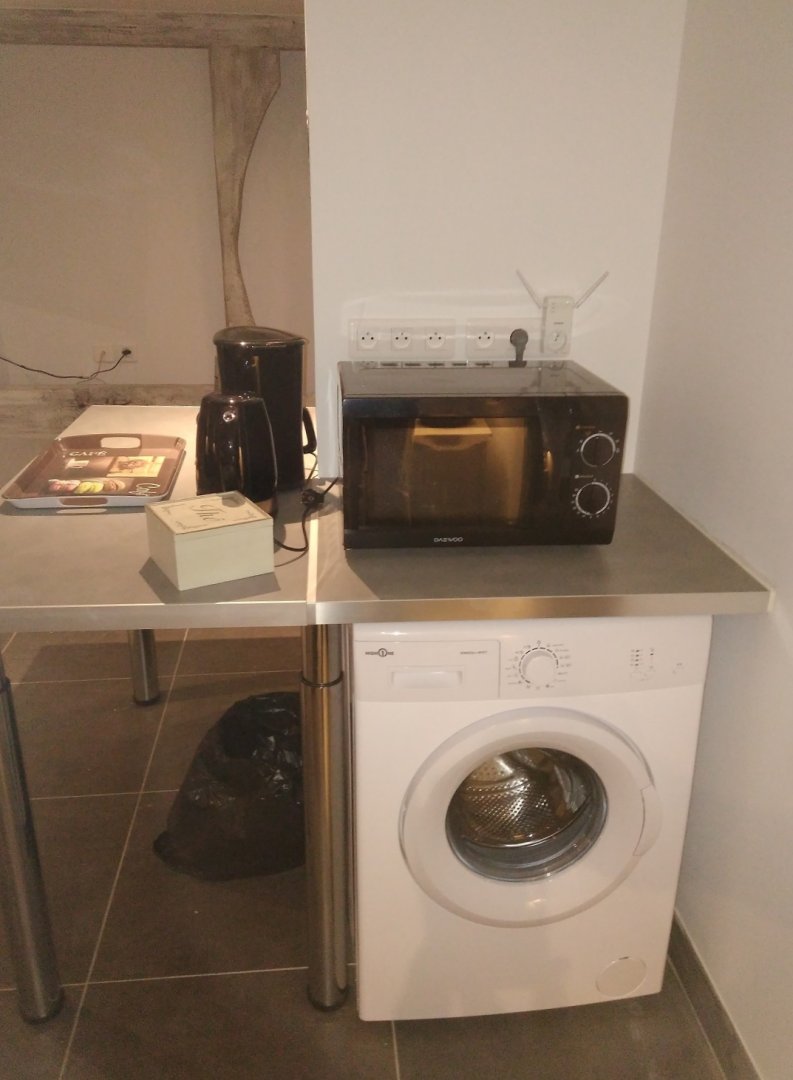 → d'une cuisine ouverte équipée (four électrique, plaques vitrocéramiques, évier inox, réfrigérateur-congélateur, machine à laver le linge, cafetière filtre et senséo, micro-ondes, bouilloire, grille-pain, …)