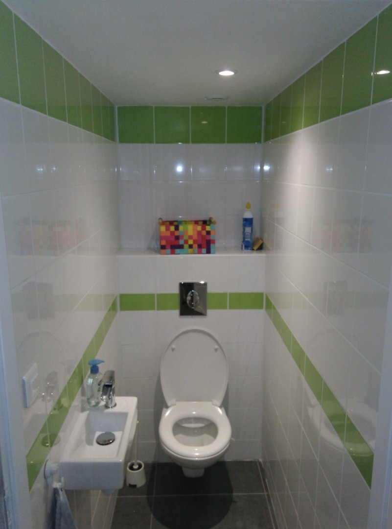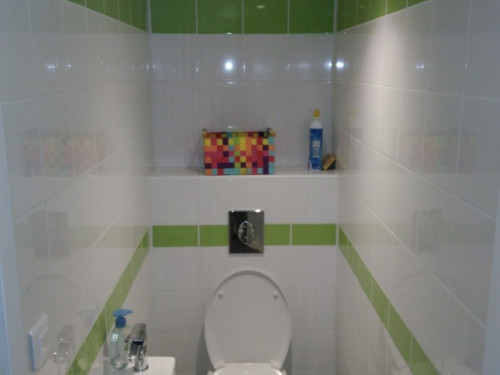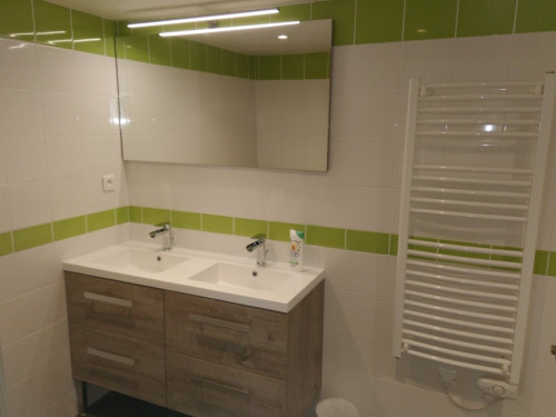 → d'une salle d'eau avec douche à l'italienne, meuble vasque et WC suspendu