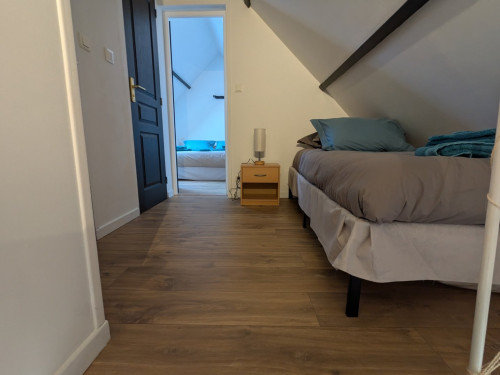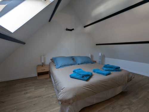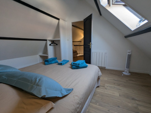 A l'étage : chambre avec 1 lit 2 personnes 160, et espace séparé avec 1 lit 1 personne, Accès avec un escalier en colimaçon.