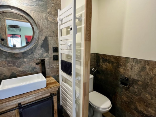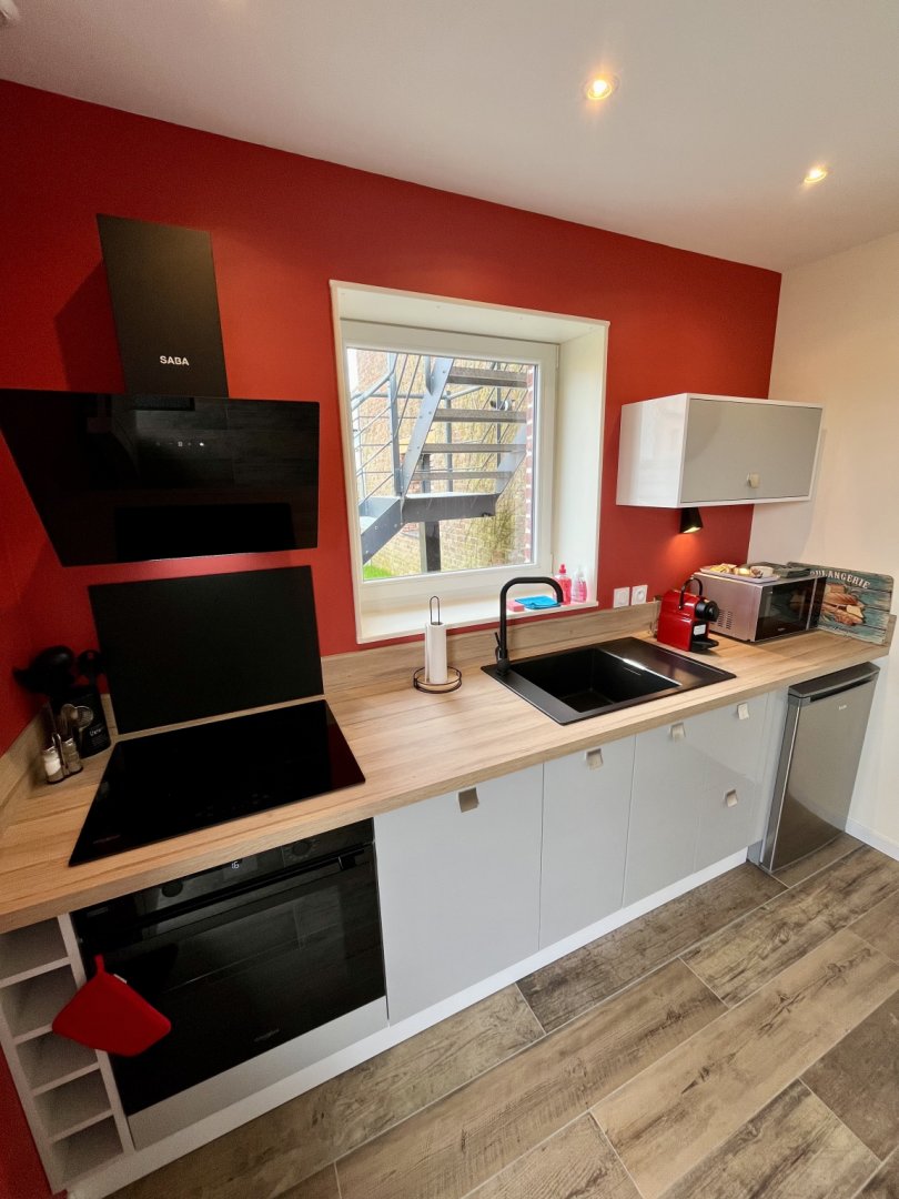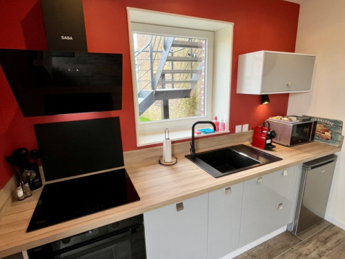 La cuisine, entièrement équipée avec des appareils modernes (four, plaque à induction, micro-ondes, bouilloire, machine à café Senseo…), est prête à accueillir vos talents culinaires, que ce soit pour préparer un petit déjeuner gourmand ou un dîner aux chandelles.
