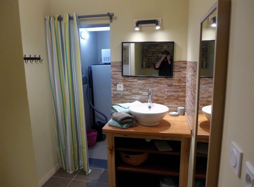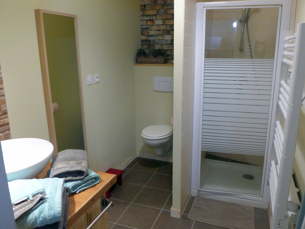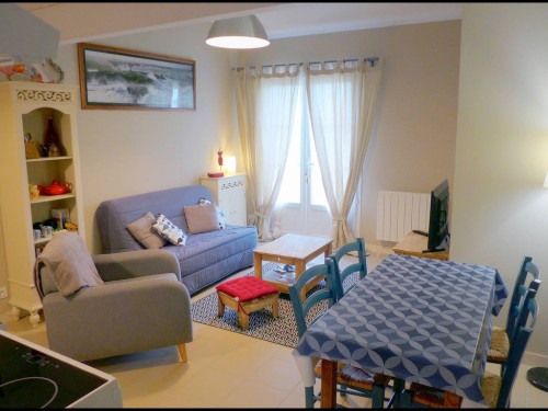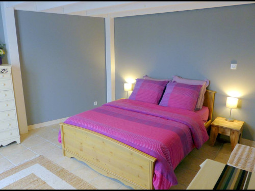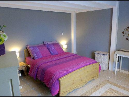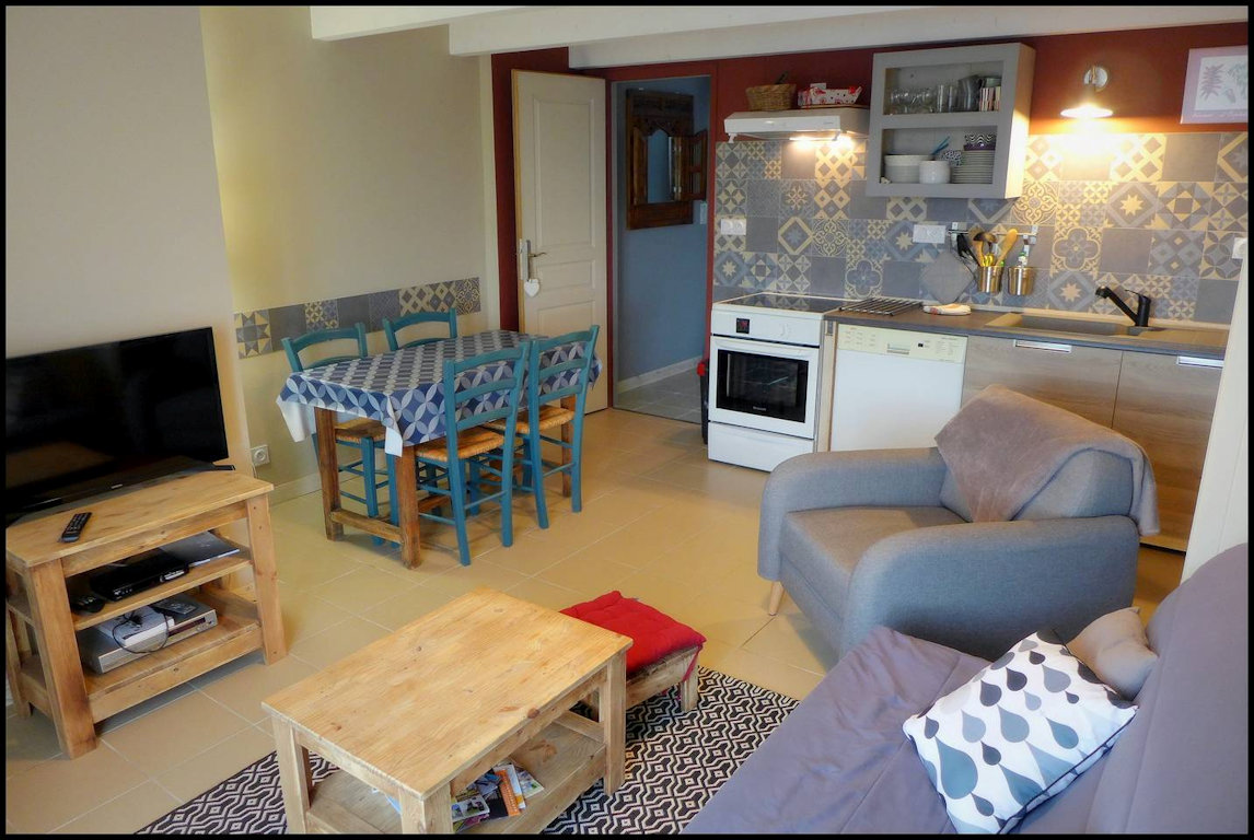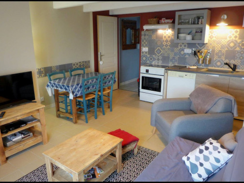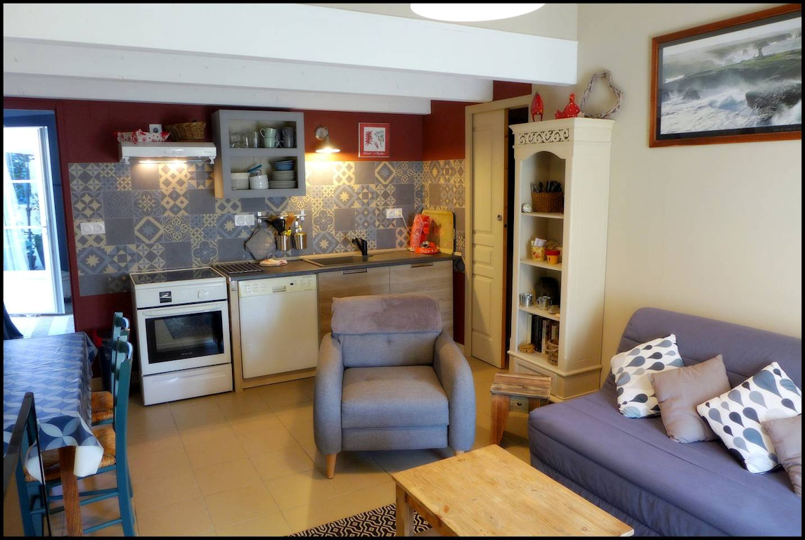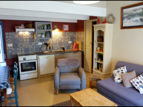 Gîte mitoyen d'environ 40 m², paisible et cosy pour des vacances reposantes comprenant : un salon / séjour / cuisine avec banquette BZ, un cellier équipé frigo / micro-ondes / lave linge, une salle d'eau avec douche, vasque et WC, et une chambre spacieuse avec lit 140x190, donnant sur une petite terrasse privée.