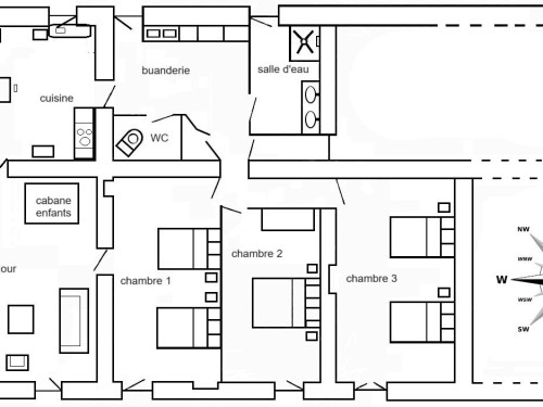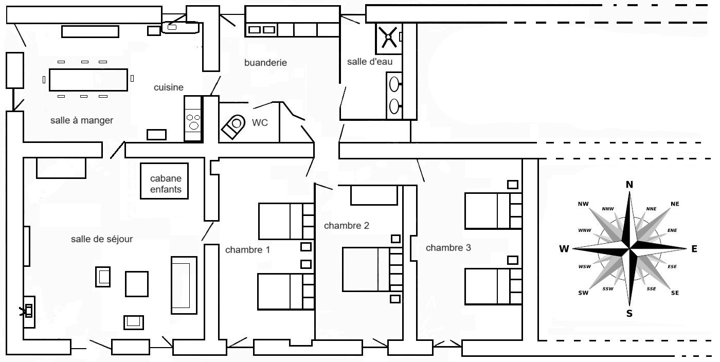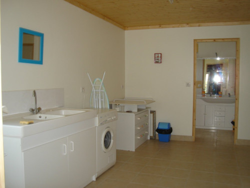 Le logement comprend trois chambres, une cuisine - salle à manger avec lave-vaisselle, un salon avec espace jeux et babyfoot, une salle d'eau et WC séparés, une buanderie avec lave-linge et table à langer.