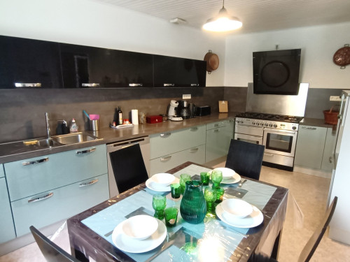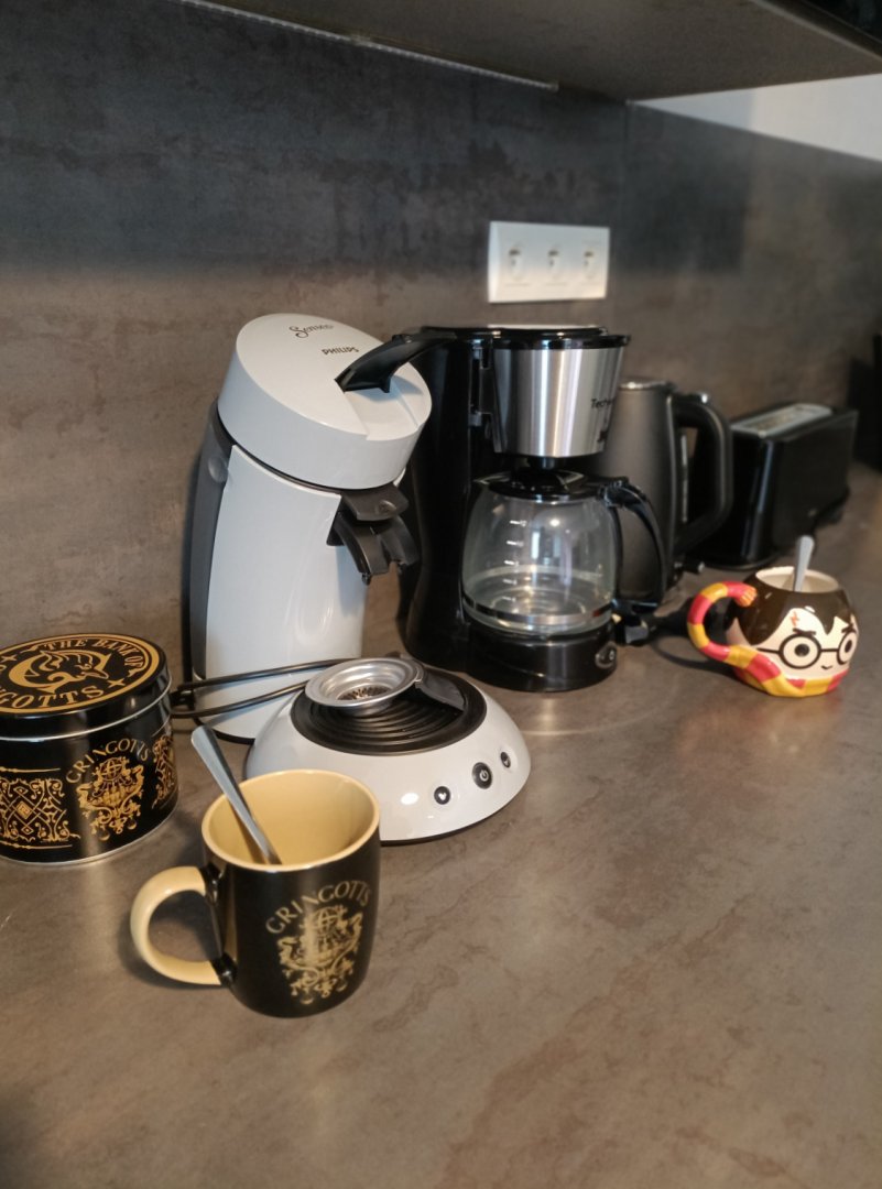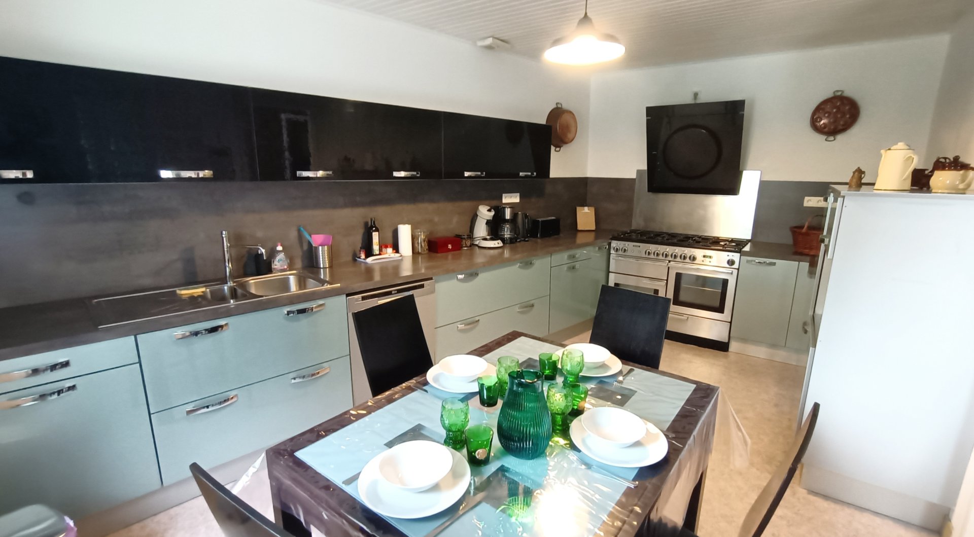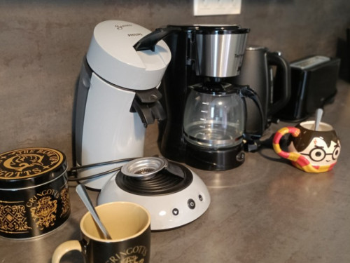 La cuisine comporte de nombreux équipements (piano de cuisson avec 2 fours gaz, four micro-ondes, bouilloire, grille-pain, cafetière filtre et cafetière Senseo, lave-vaisselle, congélateur).