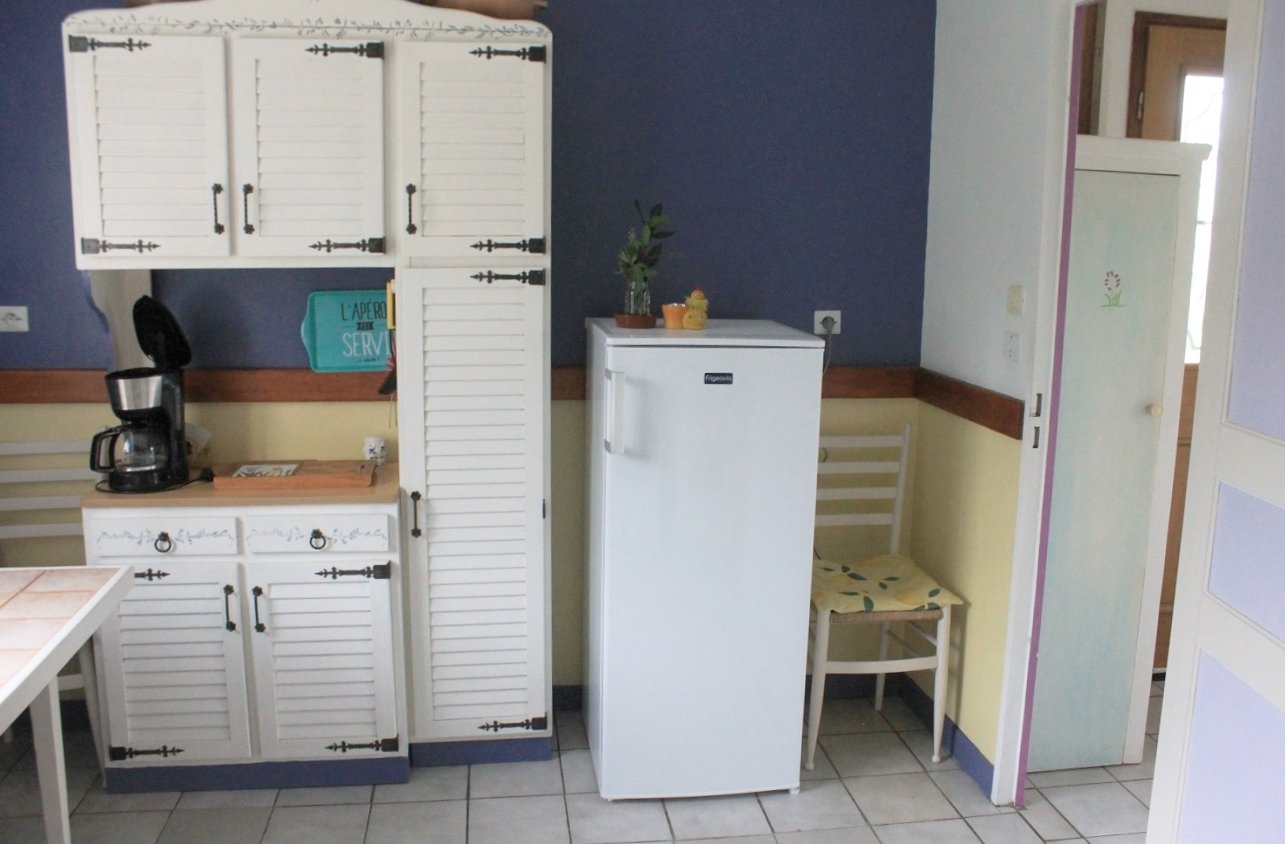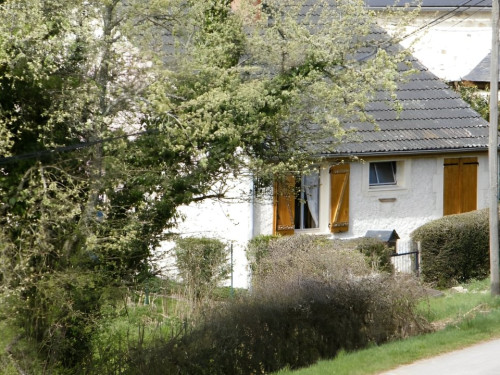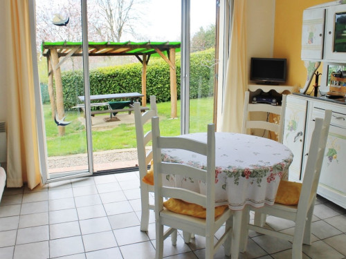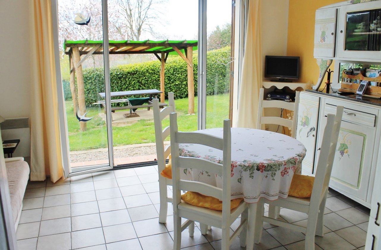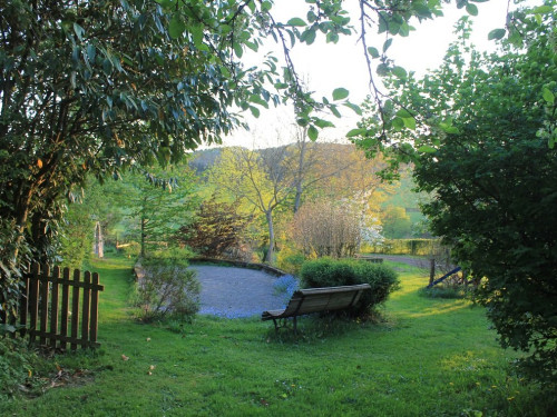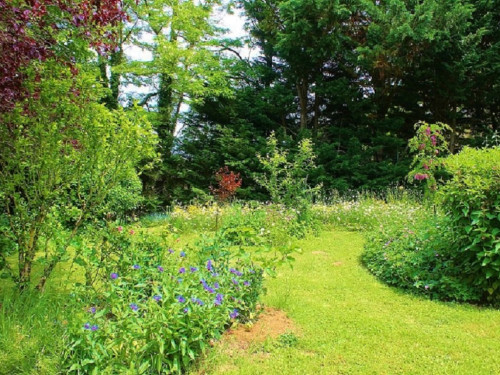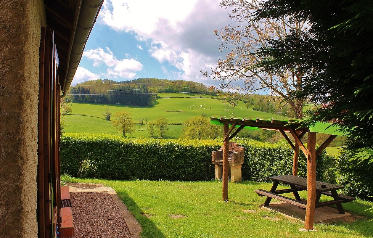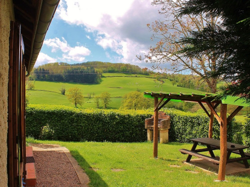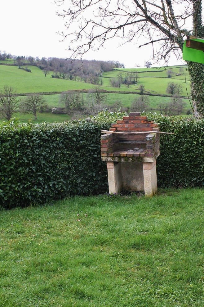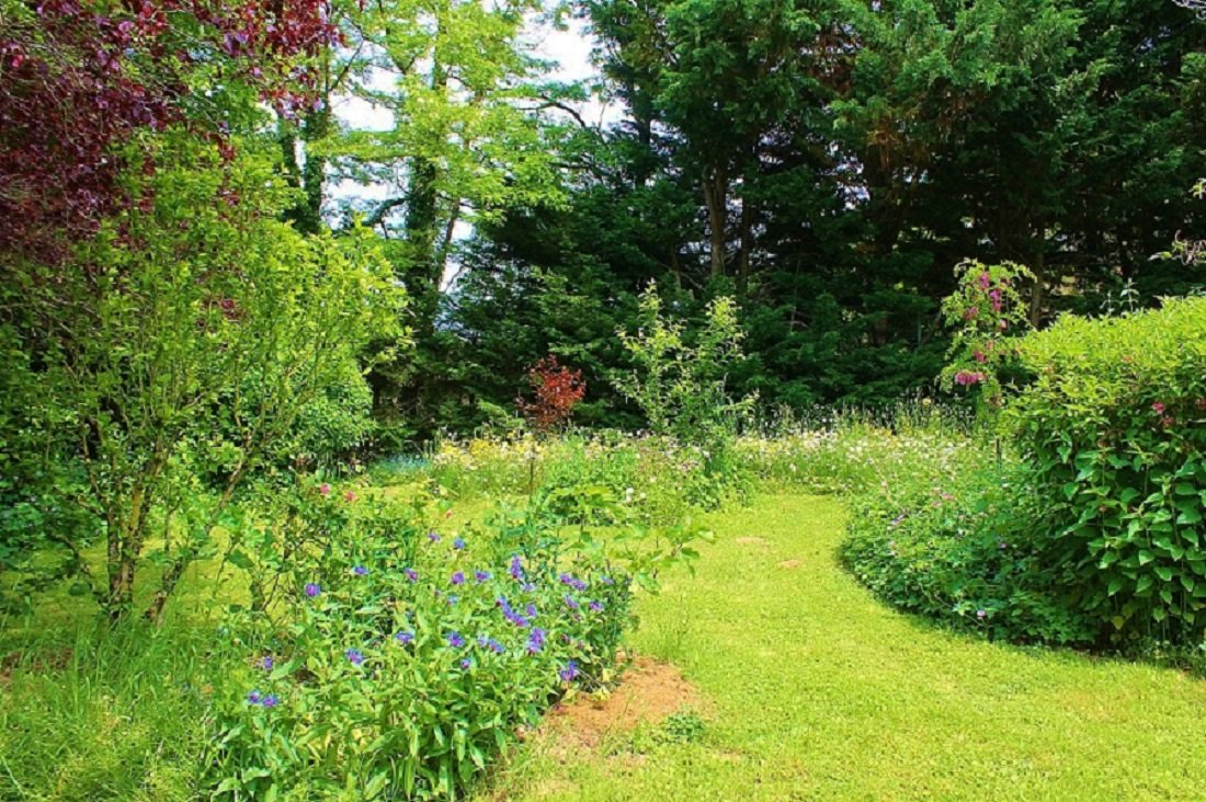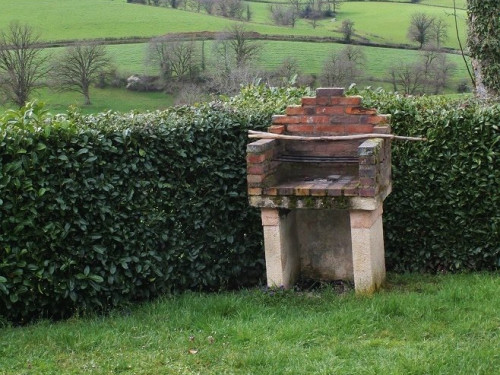 Autour de la maison, un jardin clos de haies vives, pelouse, salon de jardin, barbecue.