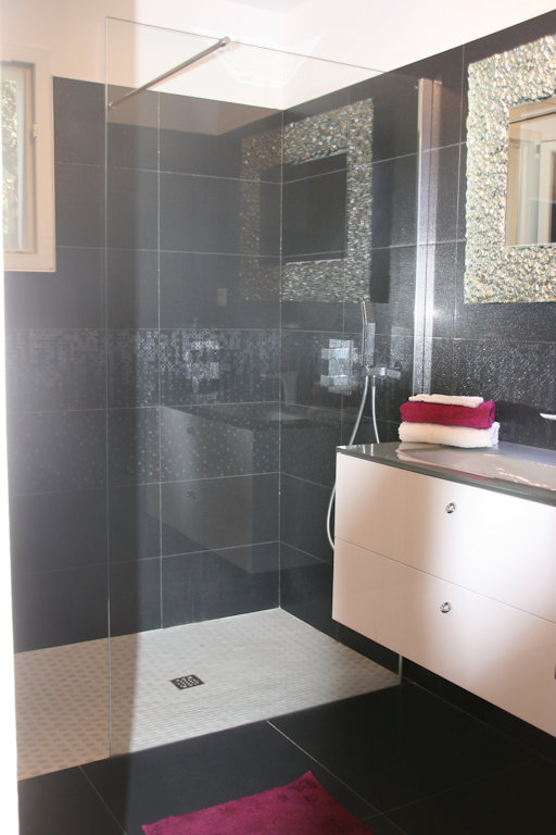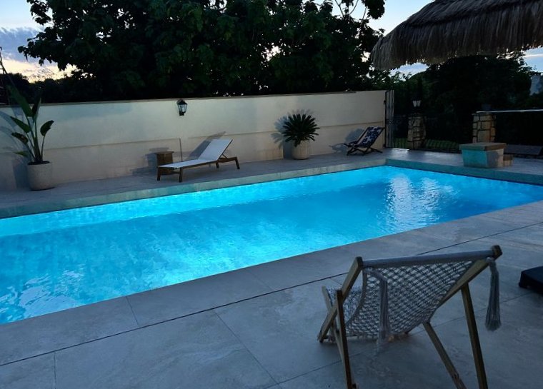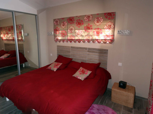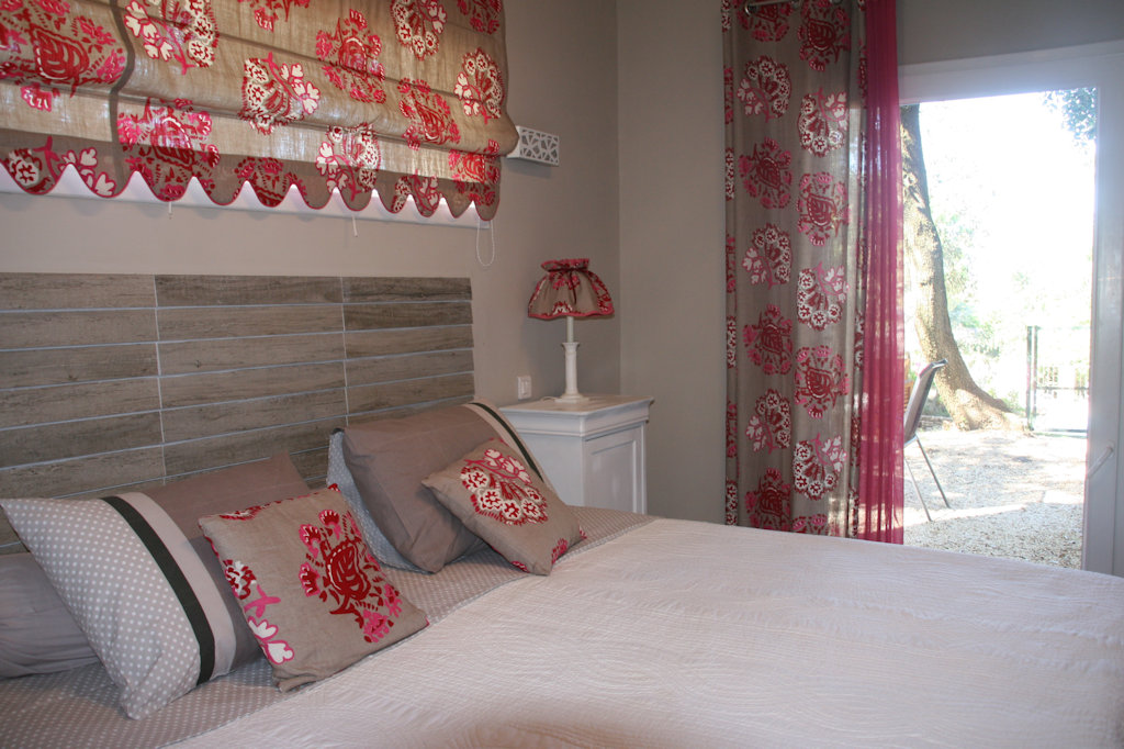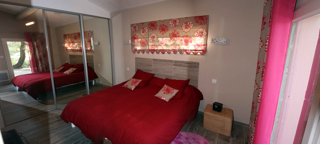 - la chambre avec un grand lit 180, une TV, et une terrasse privée avec vue sur la piscine,
