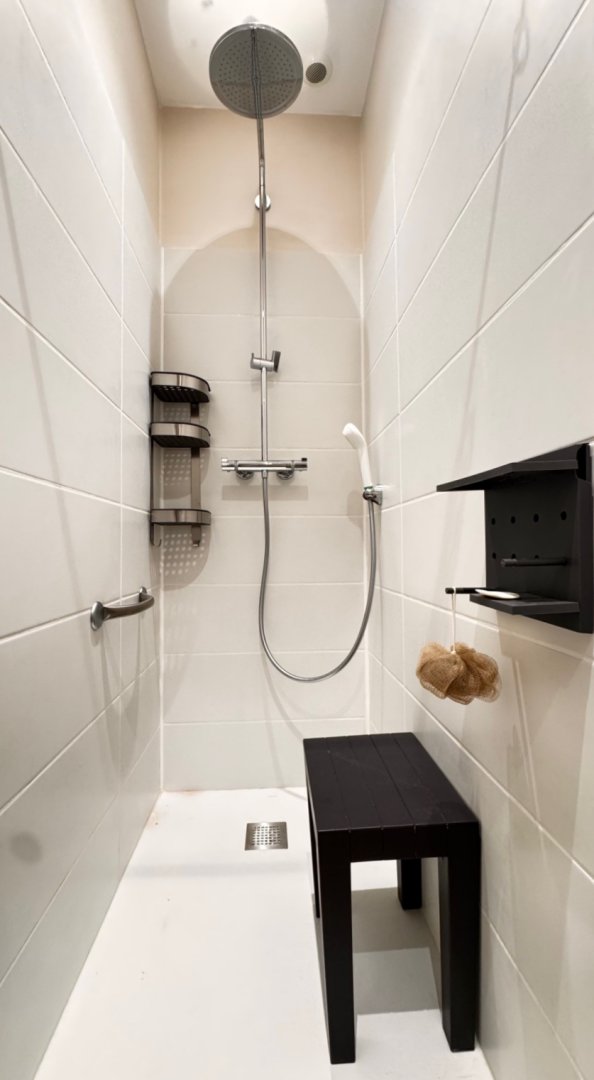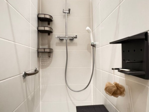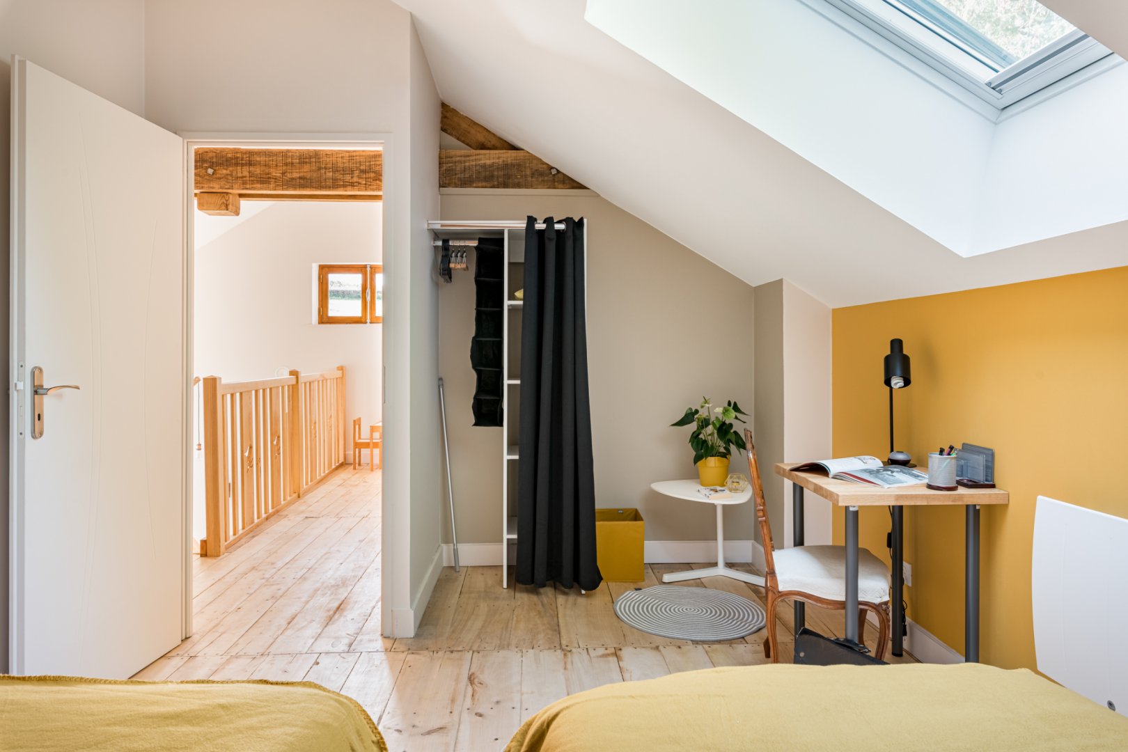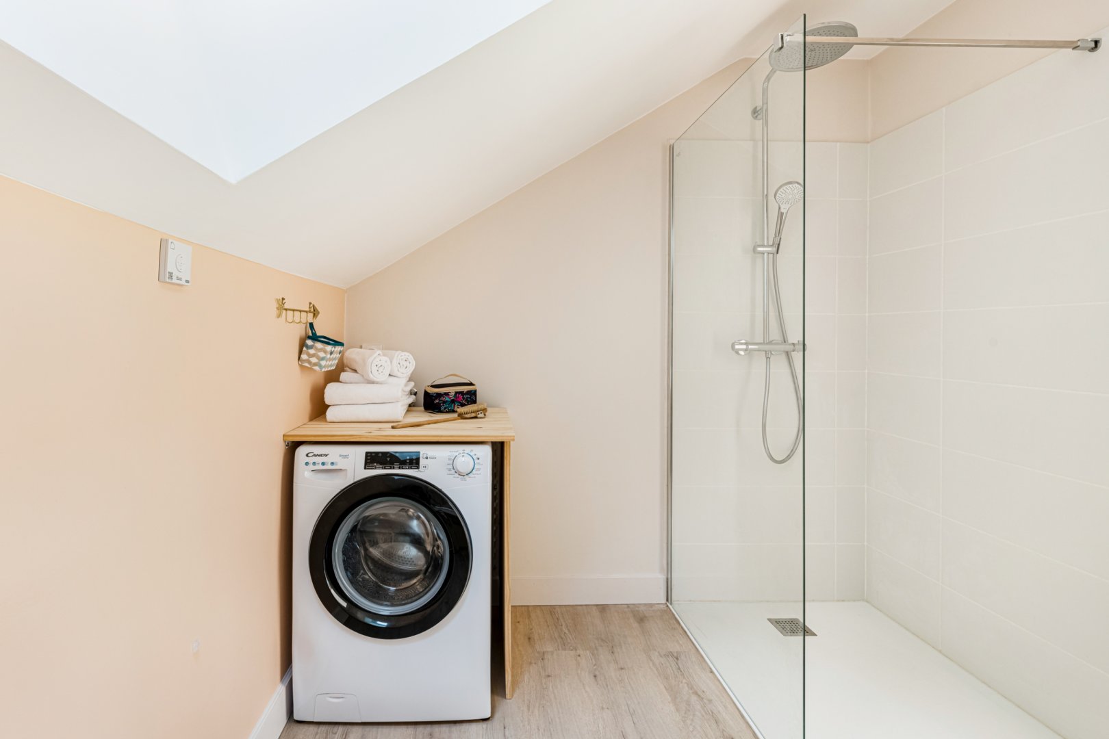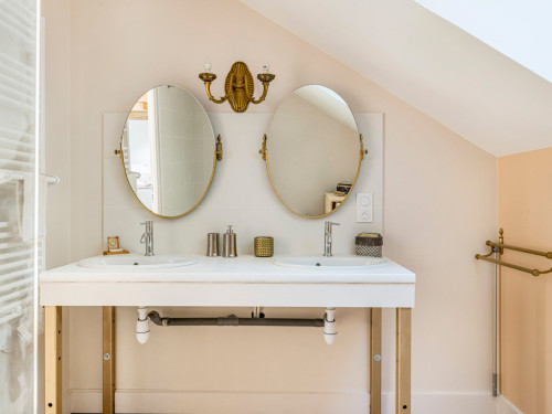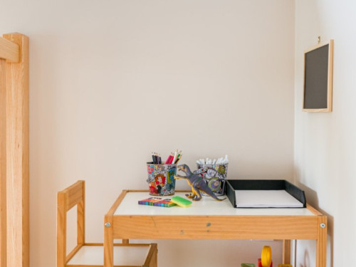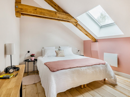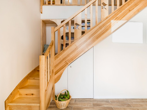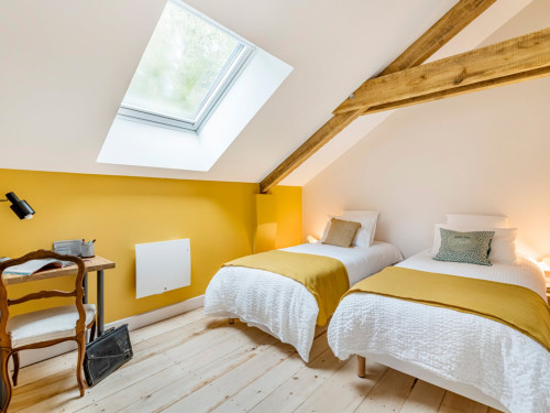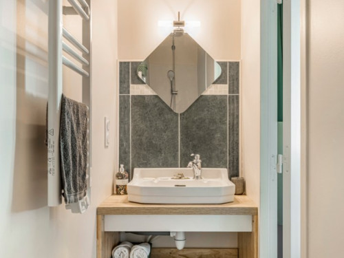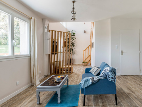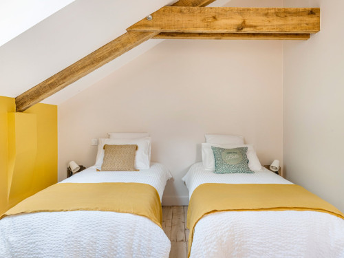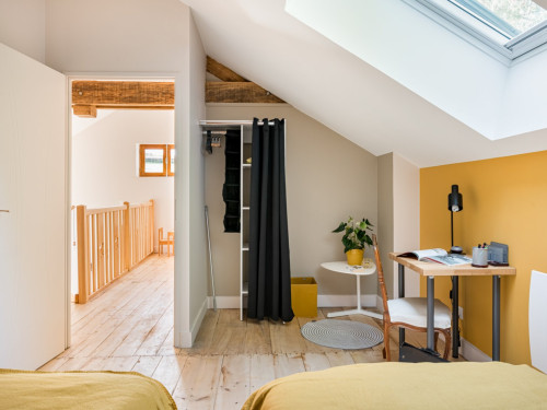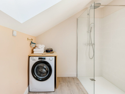 Vous trouverez au RDC la cuisine et son espace repas ouverts sur le salon, ainsi qu'une chambre avec salle de bain privative. A l'étage se trouvent deux chambres totalement modulables grâce aux lits jumeaux, ainsi qu'une salle de bain lumineuse et spacieuse avec douche de plain-pied.