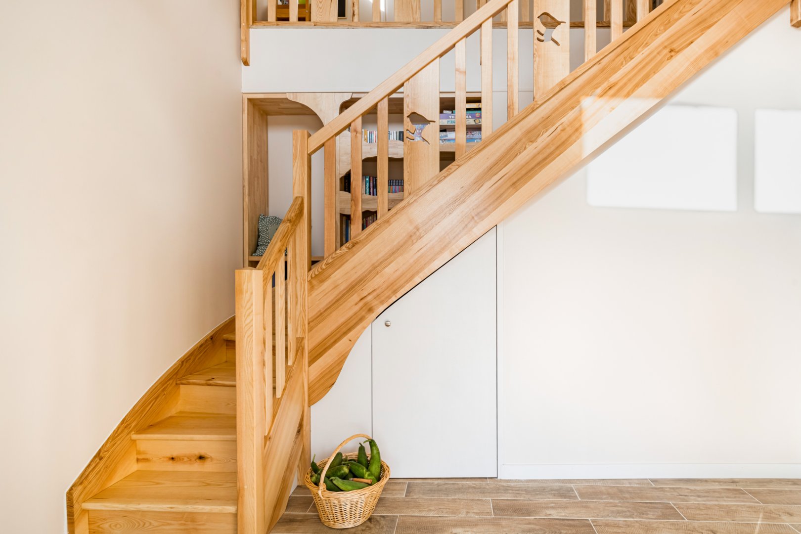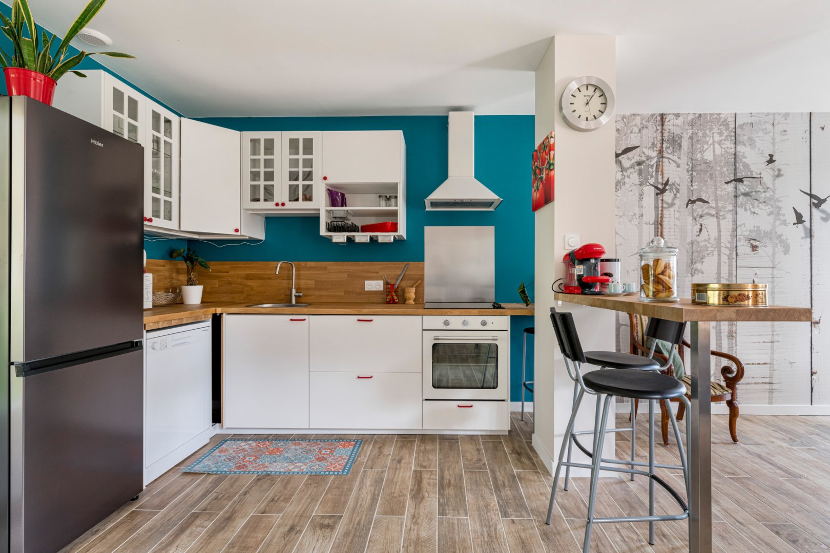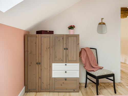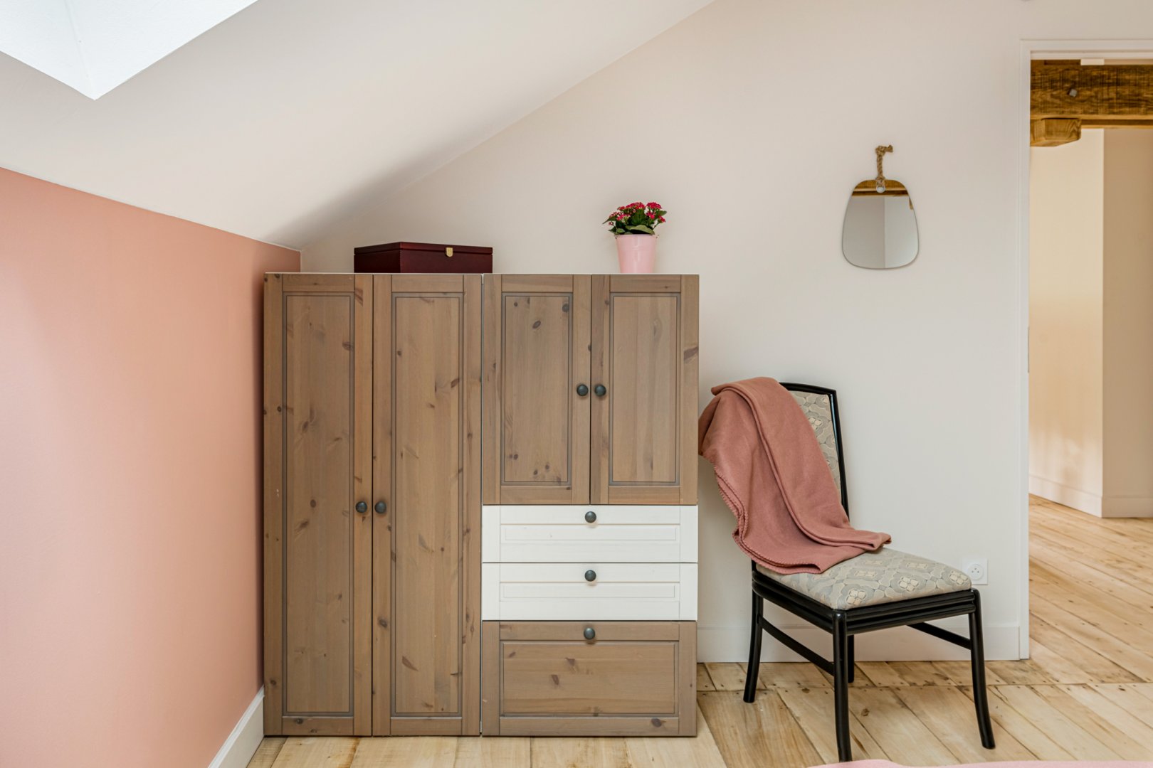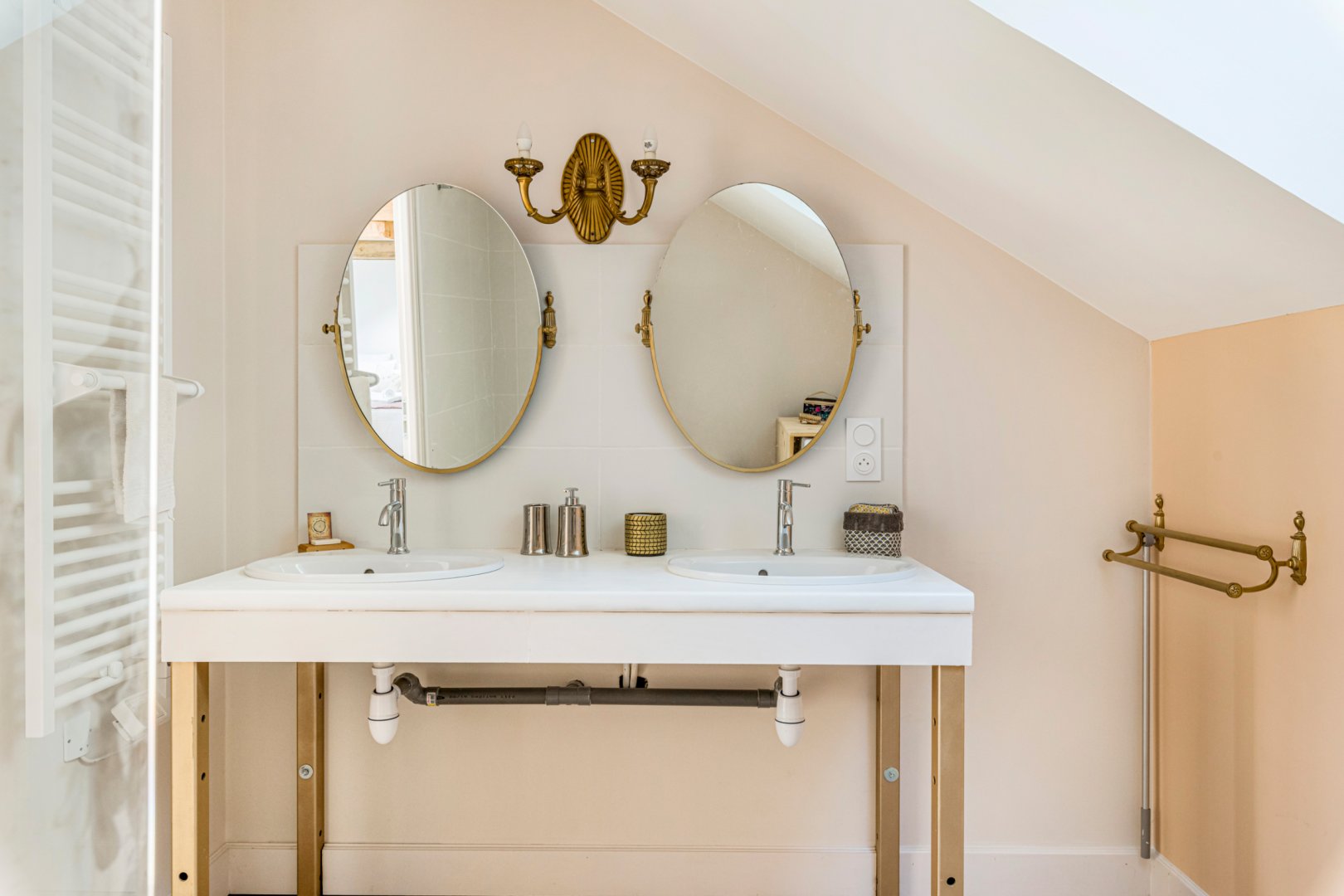 Vous trouverez au RDC la cuisine et son espace repas ouverts sur le salon, ainsi qu'une chambre avec salle de bain privative. A l'étage se trouvent deux chambres totalement modulables grâce aux lits jumeaux, ainsi qu'une salle de bain lumineuse et spacieuse avec douche de plain-pied.