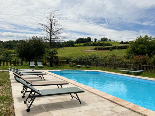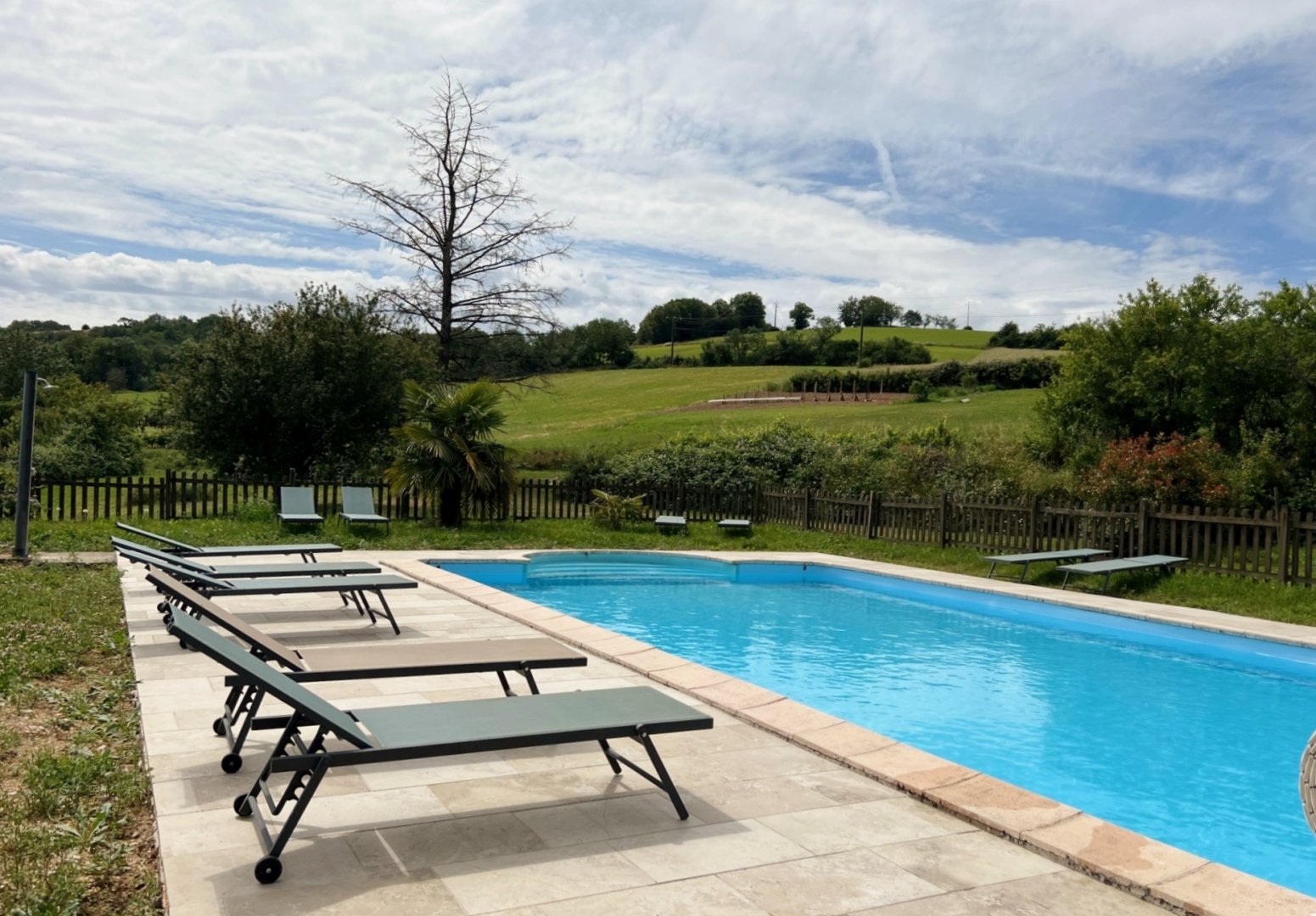 En été grande piscine partagée avec vue imprenable sur les collines.