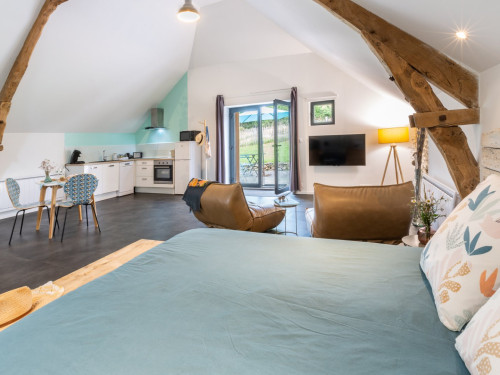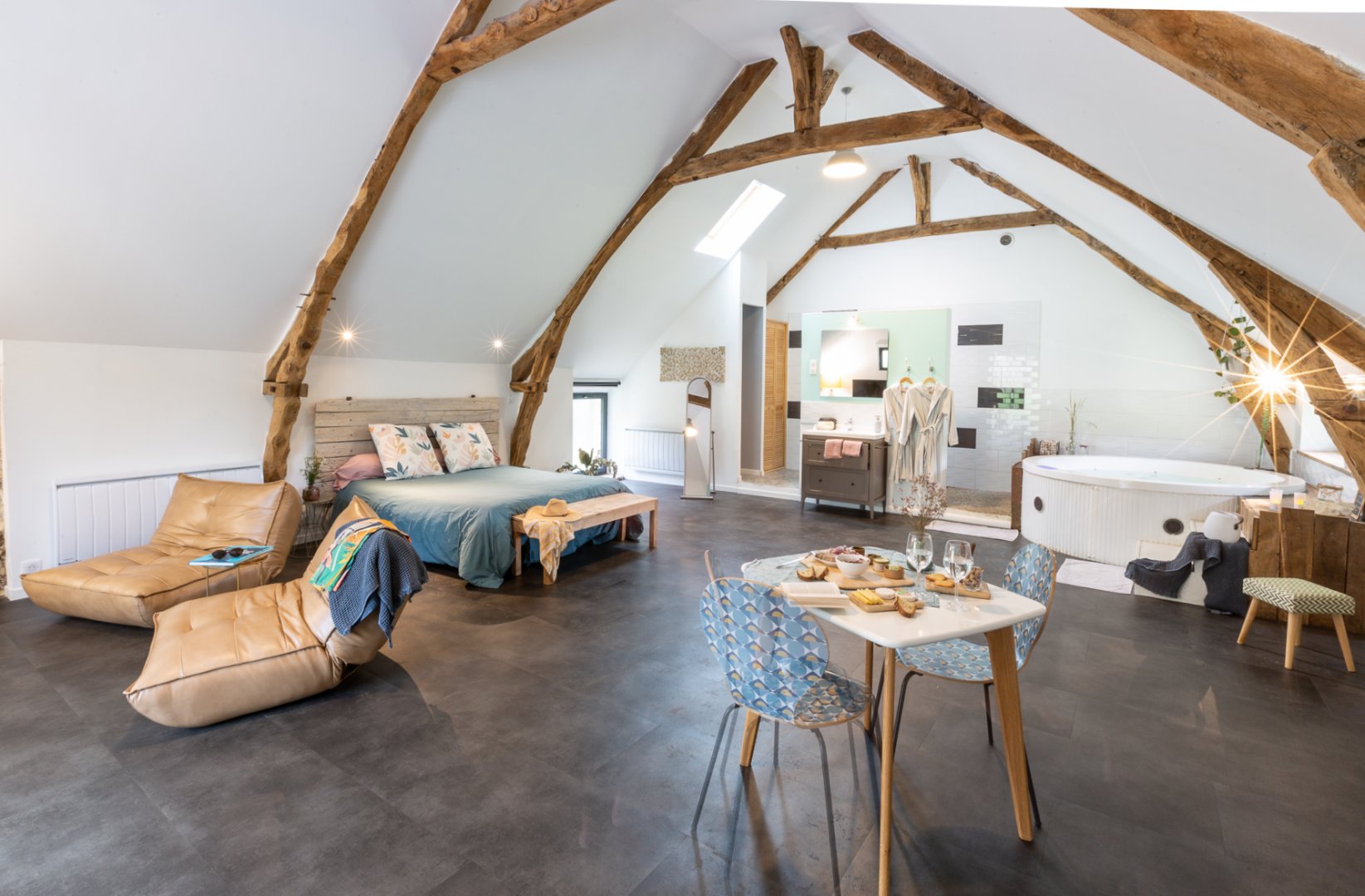 Sur plus de 70 m², celui-ci est un vaste espace ouvert où l'espace nuit, le salon, la salle de bain, le spa intérieur et le coin cuisine ont été aménagés de manière à préserver les volumes et l'architecture traditionnelle.