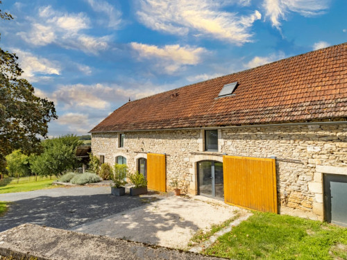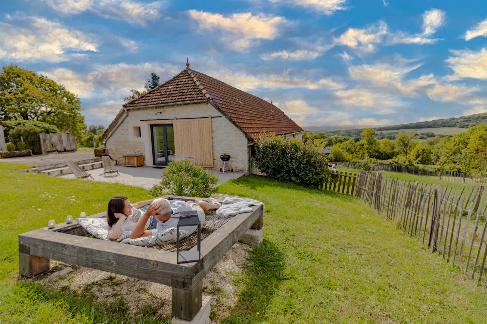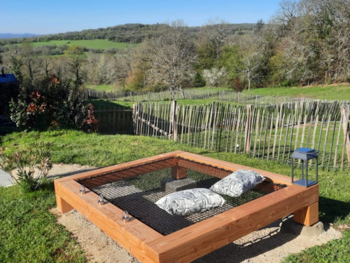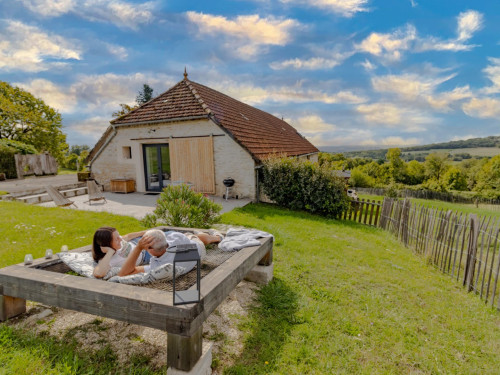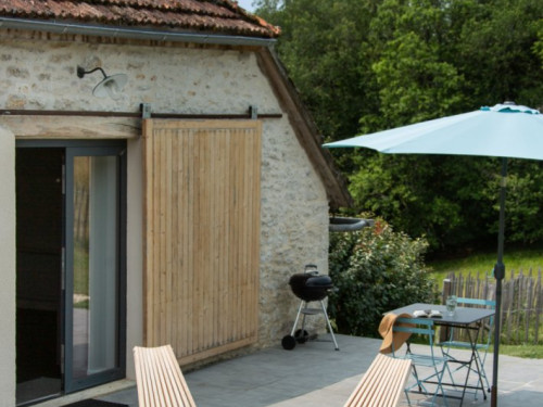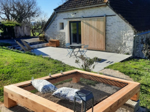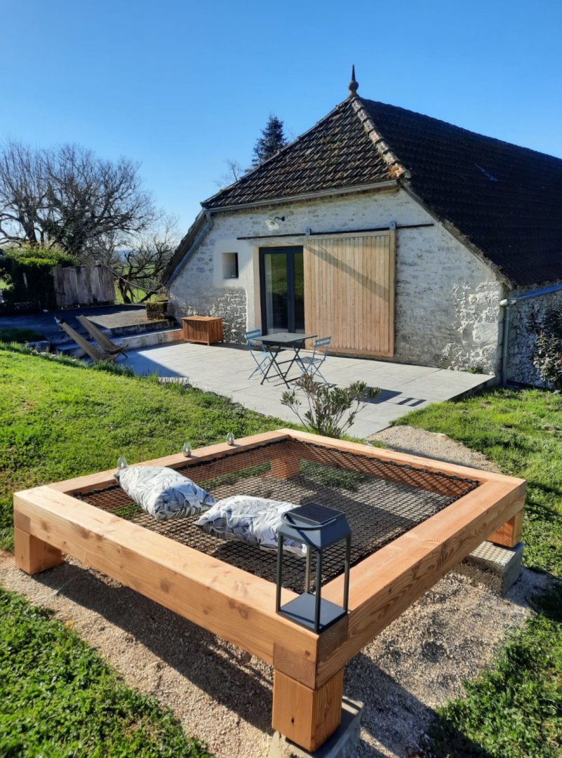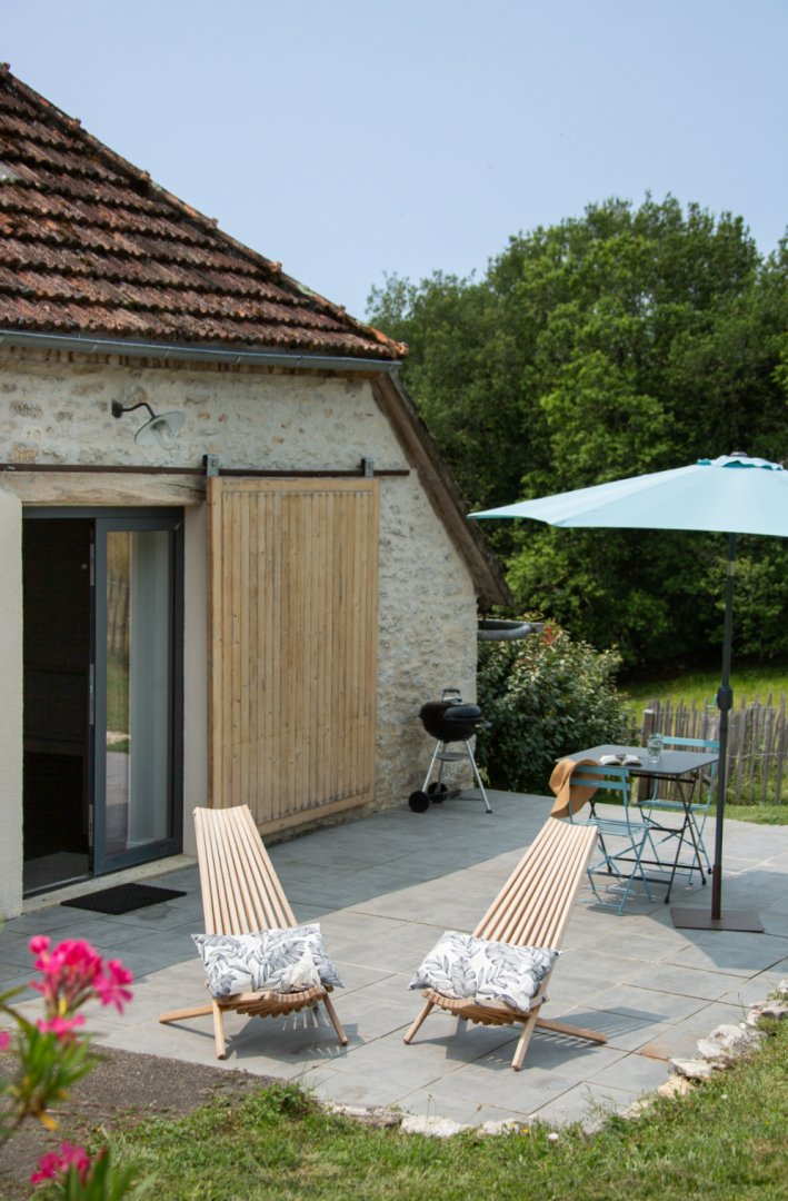 Après avoir emprunté quelques marches taillées à même le rocher du causse , vous découvrez votre terrasse privative avec son filet extérieur et faites face à un des pignons de la grange qui s'ouvre sur votre hébergement.
