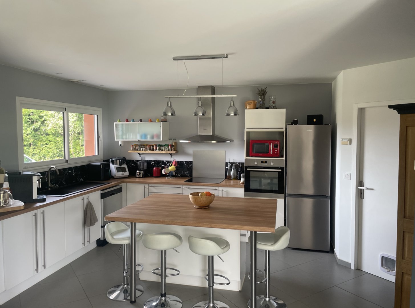La suite parentale dispose de toilettes et d'une salle de bain privative avec baignoire, ainsi qu'un fauteuil grand confort. La grande cuisine, ouverte sur le séjour, est un lieu très chaleureux. Vous pouvez y cuisiner, elle est entièrement équipée et nous mettons un frigo à disposition, qui est à l'usage exclusif des hôtes