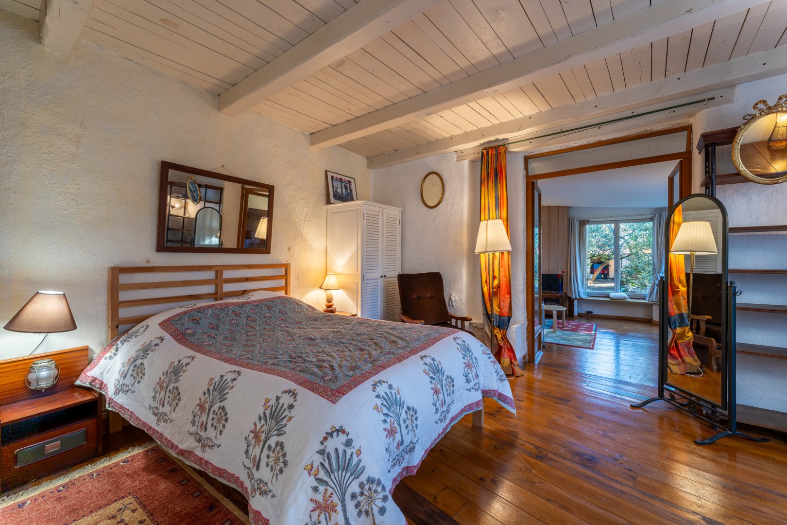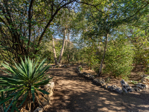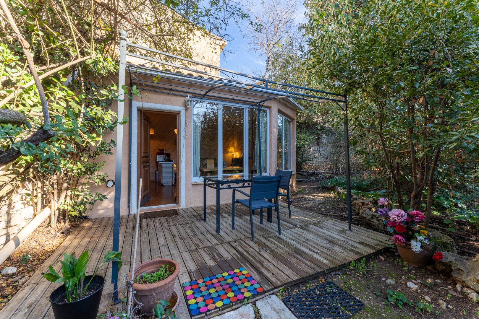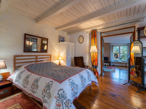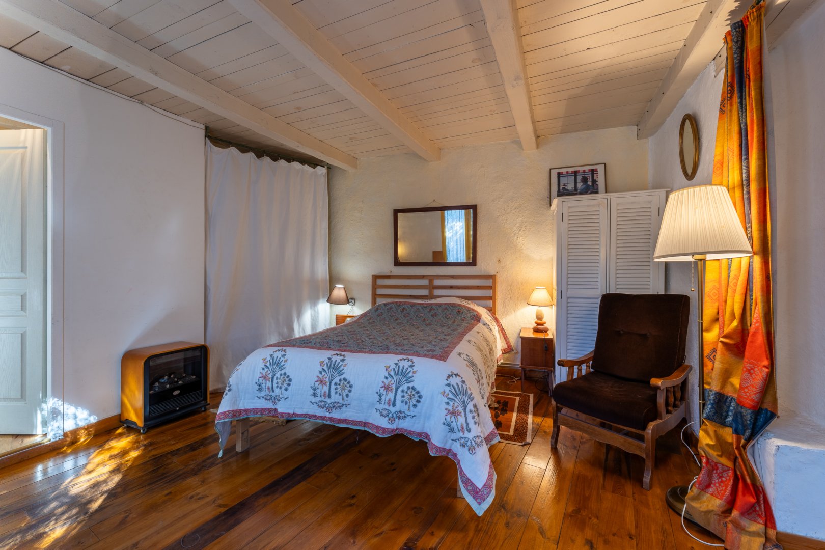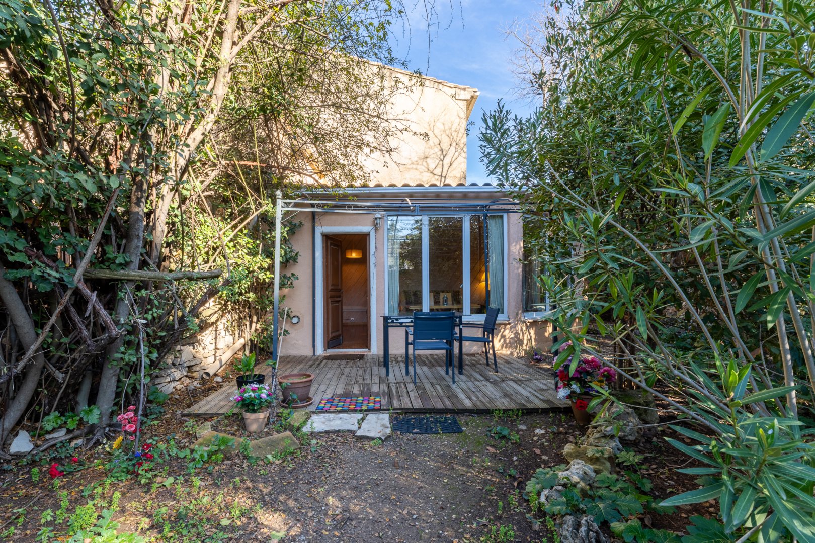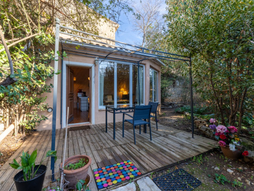 Dans village typique languedocien, petite maison aménagée avec goût, calme et très claire, avec grandes baies vitrées donnant sur un grand parc arboré d'arbres centenaires, clos d'un haut mur de pierres. Grand trampolino et table de ping pong.
