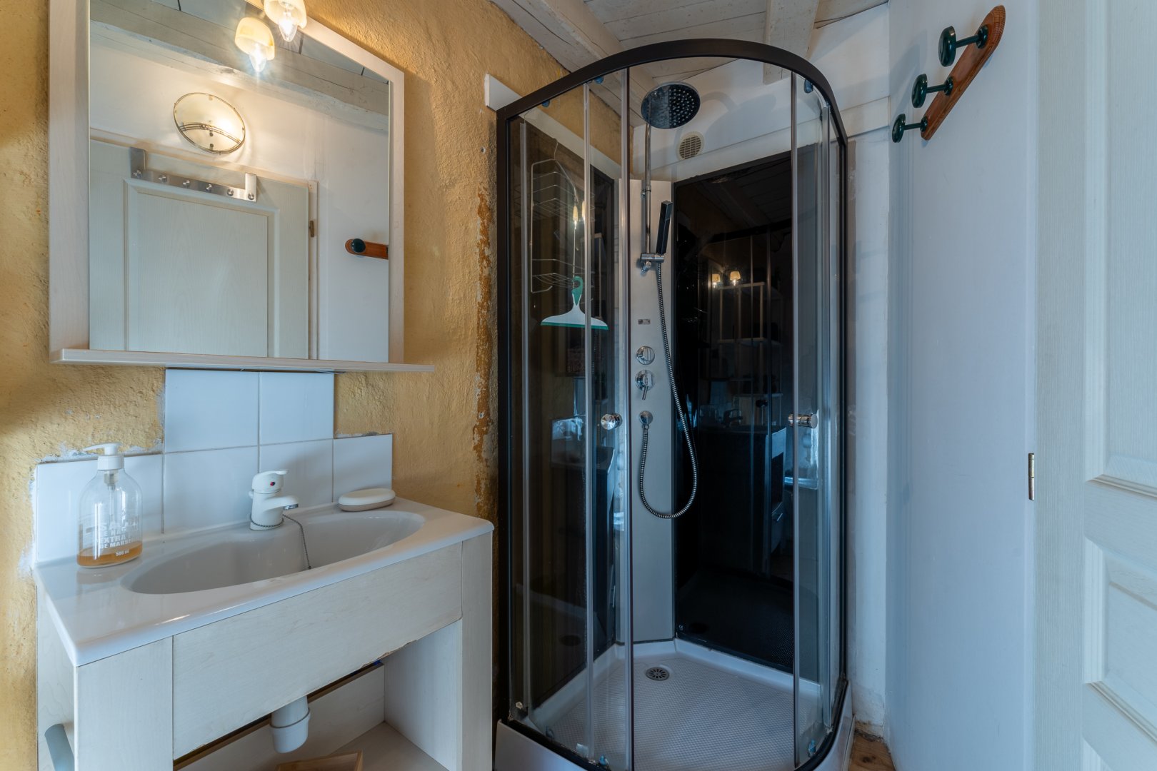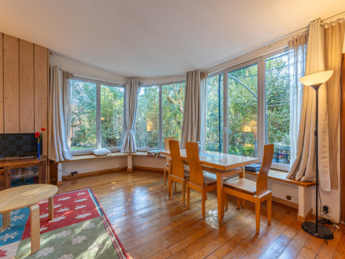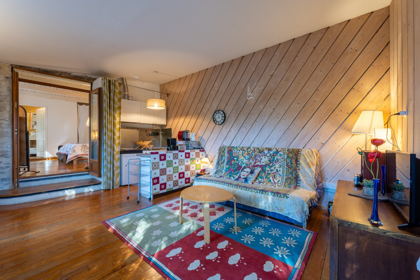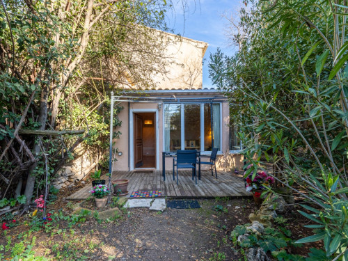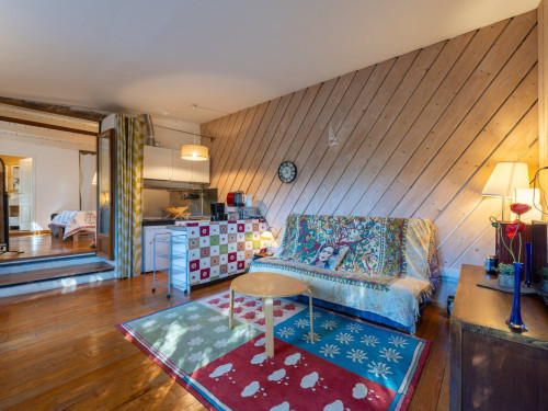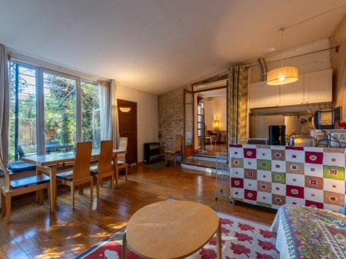 Pièce de vie avec cuisine américaine de plain-pied sur le jardin, avec un canapé-lit pour 2, 1 chambre de 25 m², une salle de douche avec toilettes.
